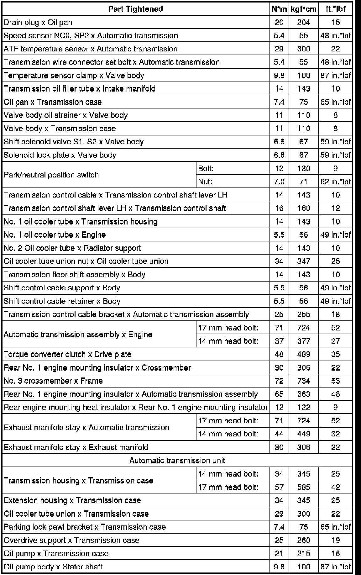 SPECIFICATIONS: A343E AUTOMATIC TRANSMISSION / TRANSAXLE: TORQUE SPECIFICATIONS