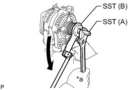 (c) Use a wrench to hold SST (A) and turn SST (B) counterclockwise to loosen the generator with clutch pulley.