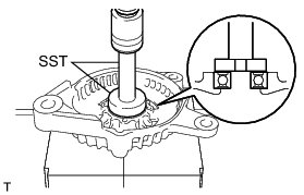 Be careful as the generator with clutch pulley or generator rotor shaft may be damaged if the position of SST is not securely maintained while performing this operation.
