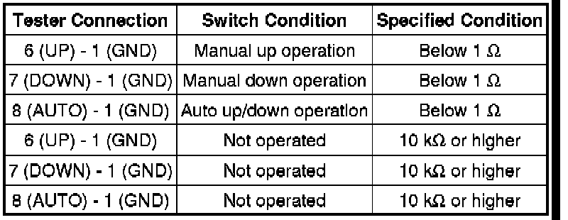 * If the result is not as specified, replace the power window regulator switch assembly.