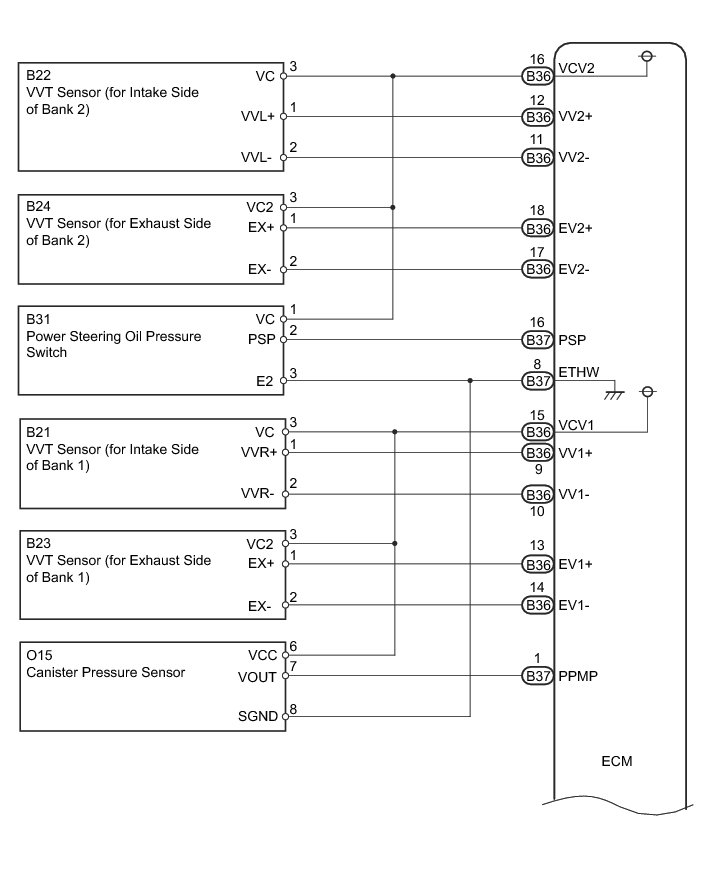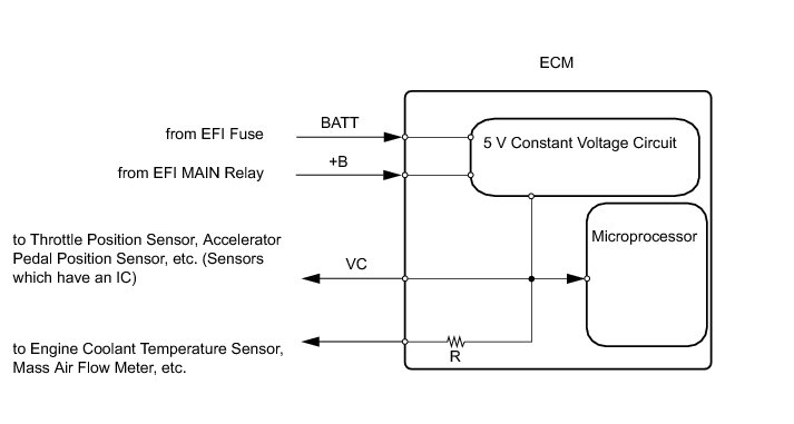 The ECM constantly generates a 5 V power source voltage from the battery voltage supplied to the +B (BATT) terminal to operate the microprocessor. The ECM also provides this power source voltage to the sensors through the VC output circuit.