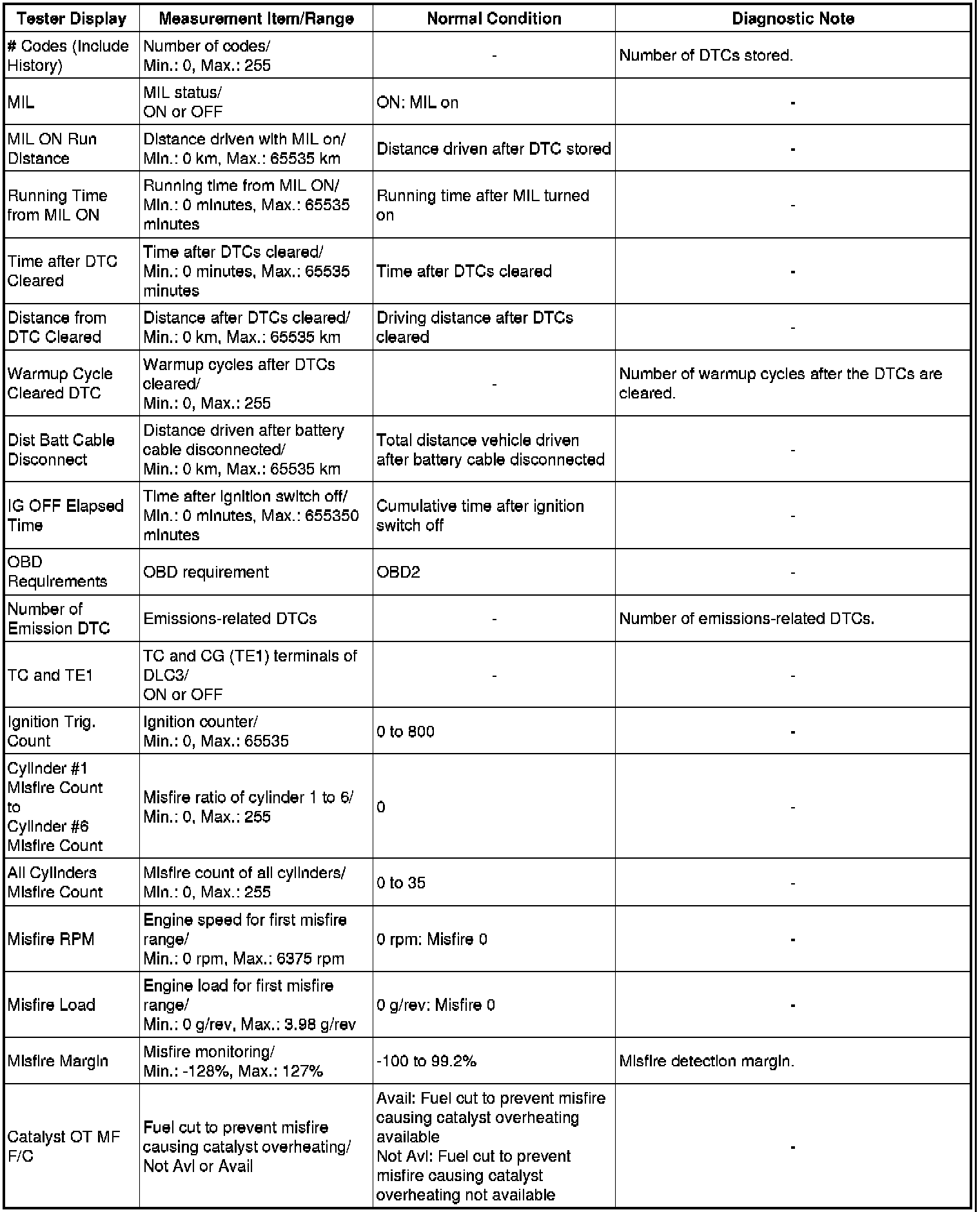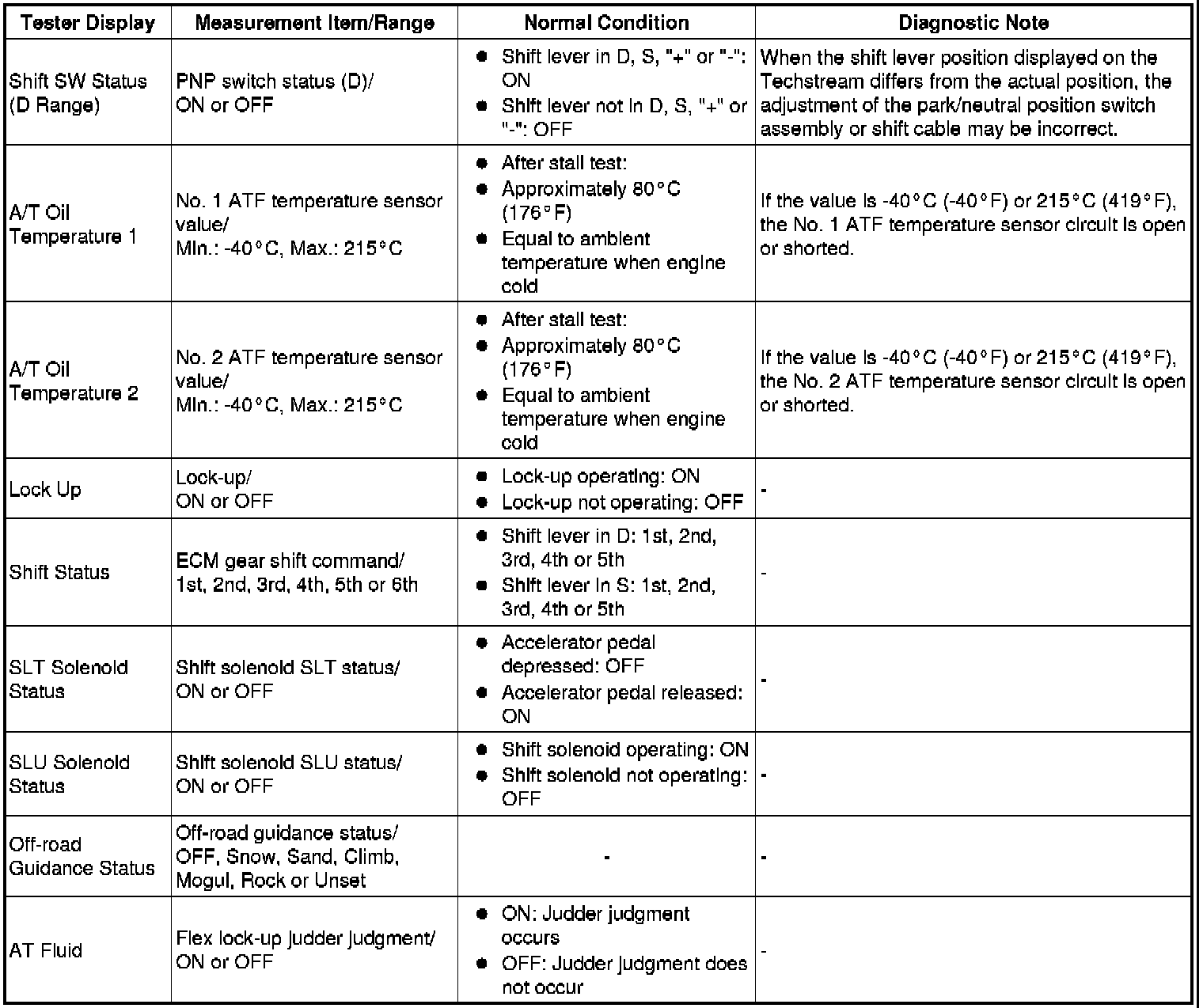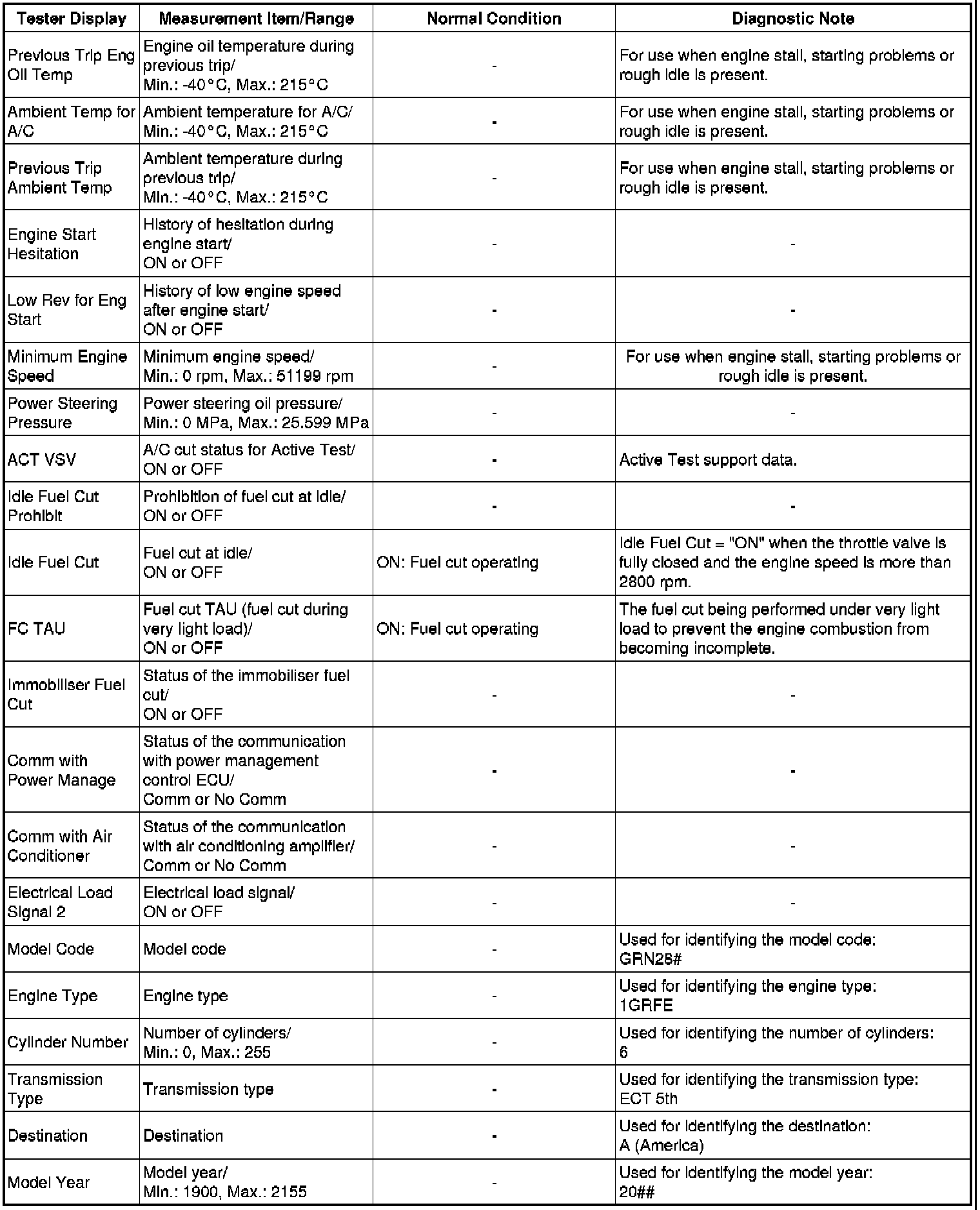 Using the Techstream to read the Data List allows the values or states of switches, sensors, actuators and other items to be read without removing any parts. This non-intrusive inspection can be very useful because intermittent conditions or signals may be discovered before parts or wiring is disturbed. Reading the Data List information early in troubleshooting is one way to save diagnostic time.