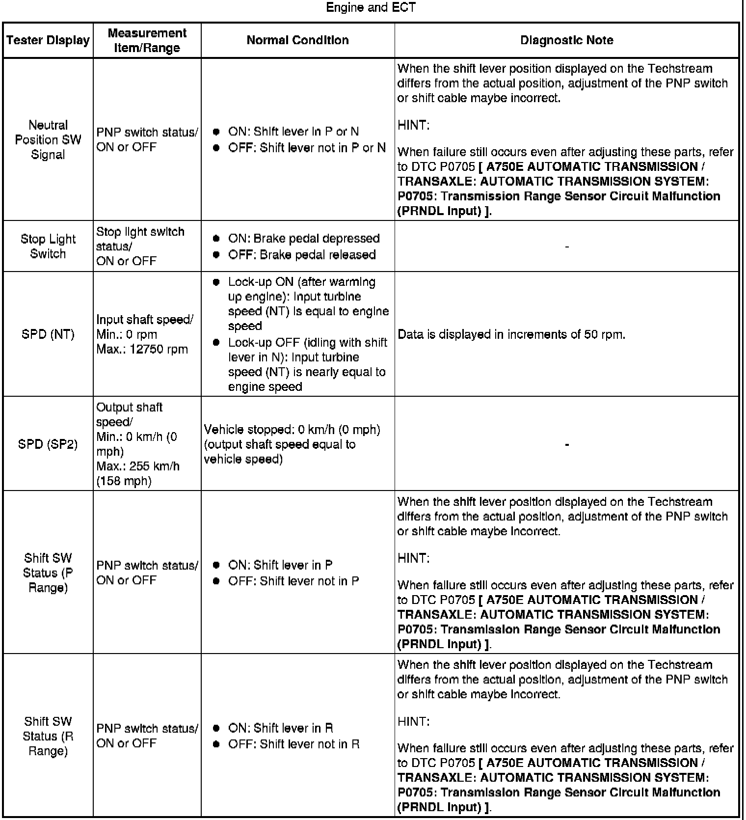 Using the Techstream to read the Data List allows the values or states of switches, sensors, actuators and other items to be read without removing any parts. This non-intrusive inspection can be very useful because intermittent conditions or signals may be discovered before parts or wiring is disturbed. Reading the Data List information early in troubleshooting is one way to save diagnostic time.