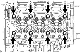 Temporarily install the 8 bolts in the order shown in the illustration.