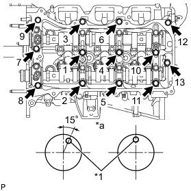 Install the camshaft housing sub-assembly LH and tighten the 13 bolts in the order shown in the illustration.