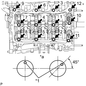 Install the camshaft housing sub-assembly RH and tighten the 12 bolts in the order shown in the illustration.