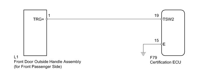 If the front passenger side door entry lock function does not operate but the entry unlock function operates, the communication between the vehicle and electrical key transmitter is normal. The malfunctioning part may be an entry lock sensor circuit (front door outside handle assembly [for front passenger side] -> certification ECU).