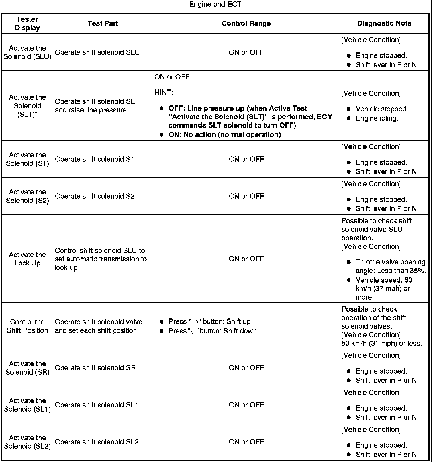 *: Activate the Solenoid (SLT) in the Active Test is performed to check the line pressure changes by connecting SST to the automatic transmission, which is used in the Hydraulic Test Hydraulic Test as well. Note that the pressure values in the Active Test and Hydraulic Test are different.