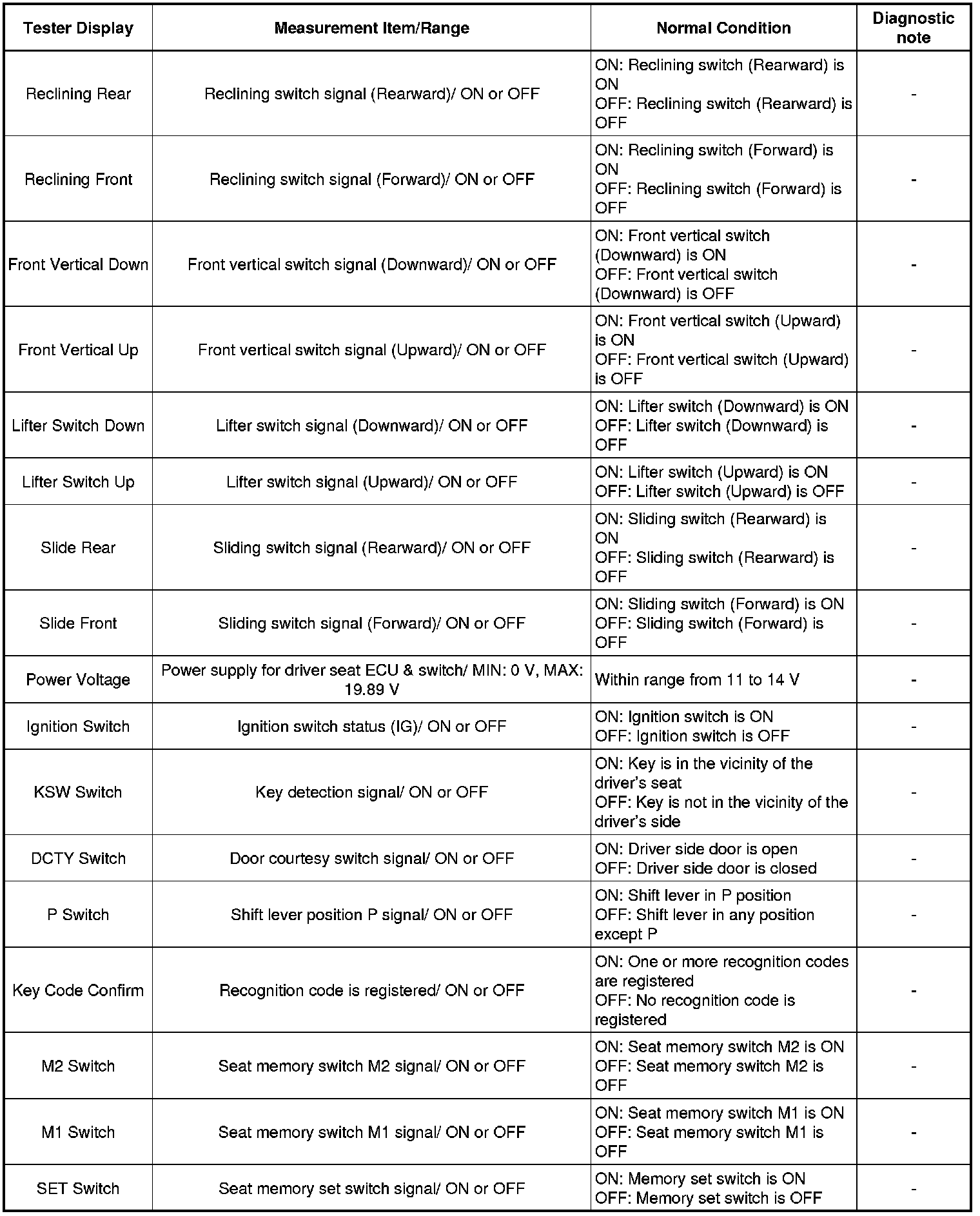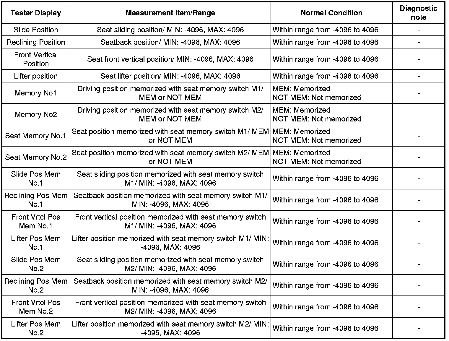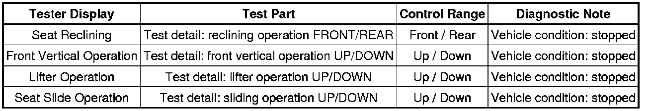 SEAT: FRONT POWER SEAT CONTROL SYSTEM (w/ Memory): DATA LIST / ACTIVE TEST
