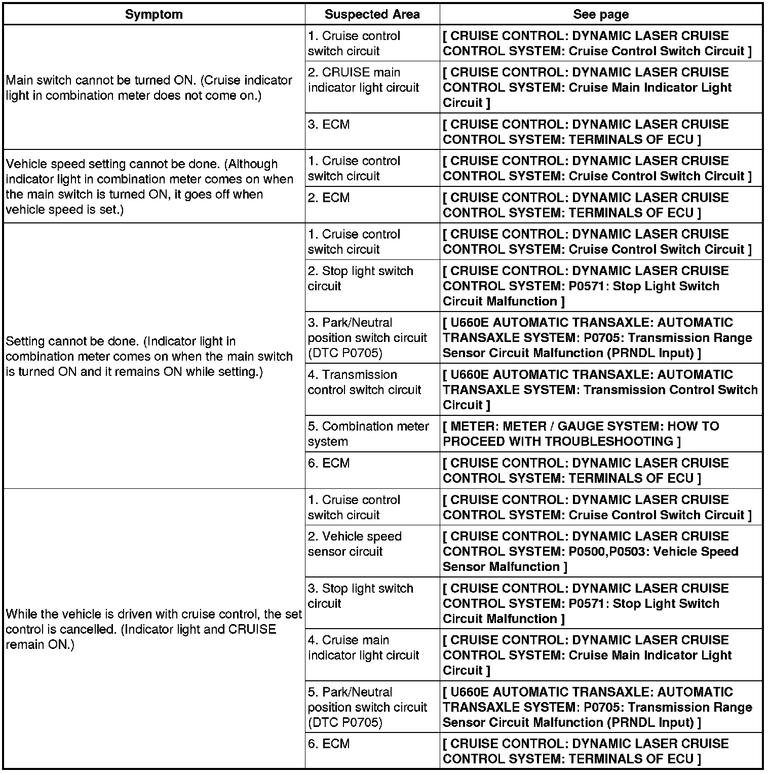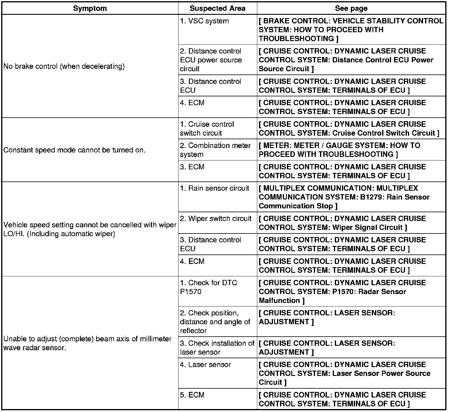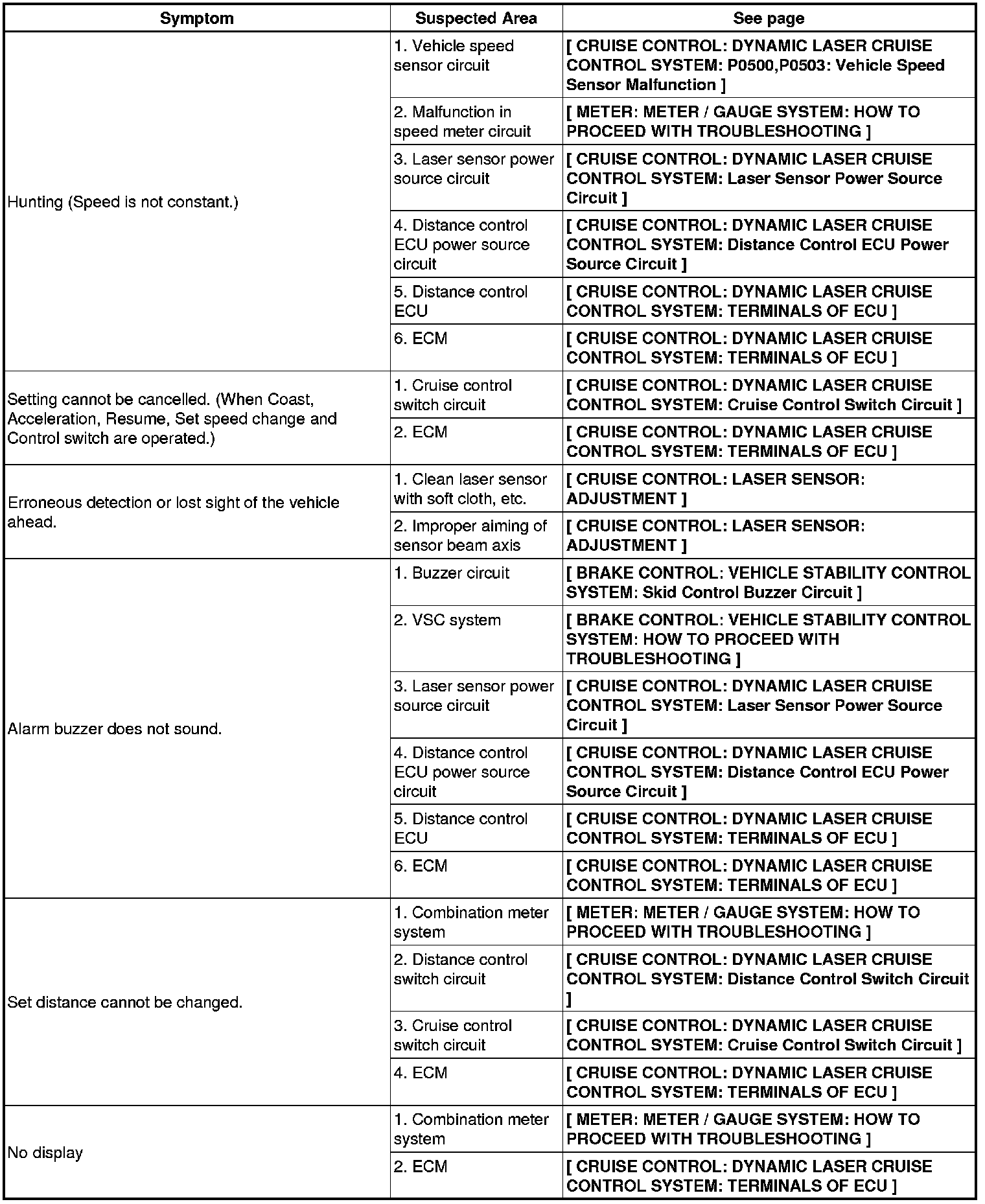CRUISE CONTROL: DYNAMIC LASER CRUISE CONTROL SYSTEM: PROBLEM SYMPTOMS TABLE