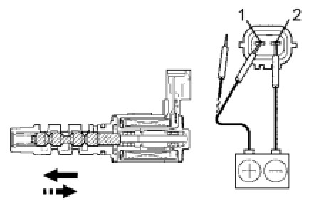 (b) Connect the battery's positive (+) lead to terminal 1 and negative (-) lead to terminal 2. Check the movement of the valve.