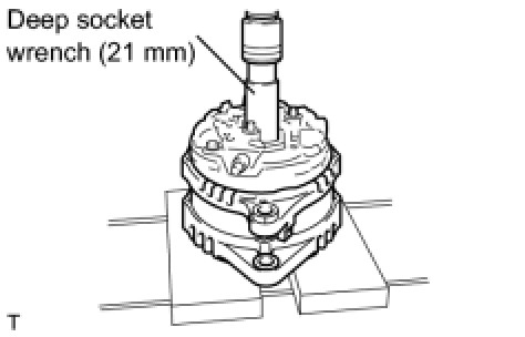 (a) Using deep socket wrench (21 mm) and a press, slowly press in the generator coil assembly.