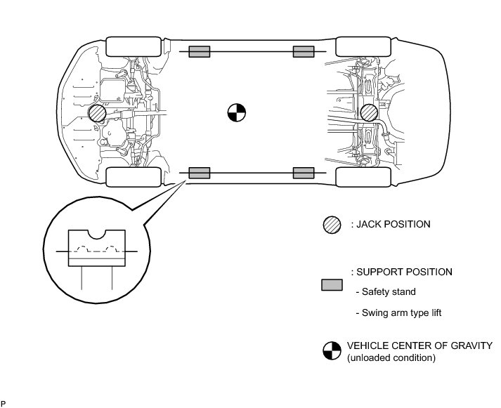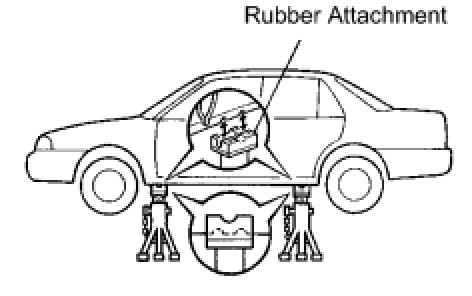 (b) When removing any heavy components like the engine or transaxle, the vehicle center of gravity will shift. To stabilize the vehicle, place a balance weight in a location that will prevent the vehicle from rolling or shifting, or place a transmission jack under the appropriate jack position at the opposite end of the vehicle.