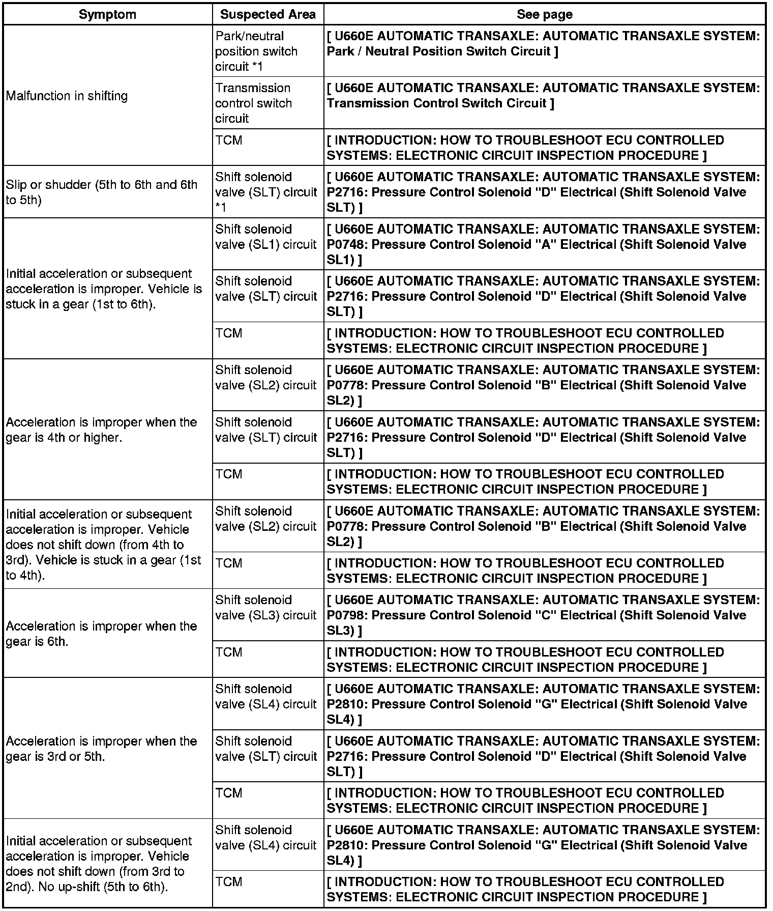 U660E AUTOMATIC TRANSAXLE: AUTOMATIC TRANSAXLE SYSTEM: PROBLEM SYMPTOMS TABLE