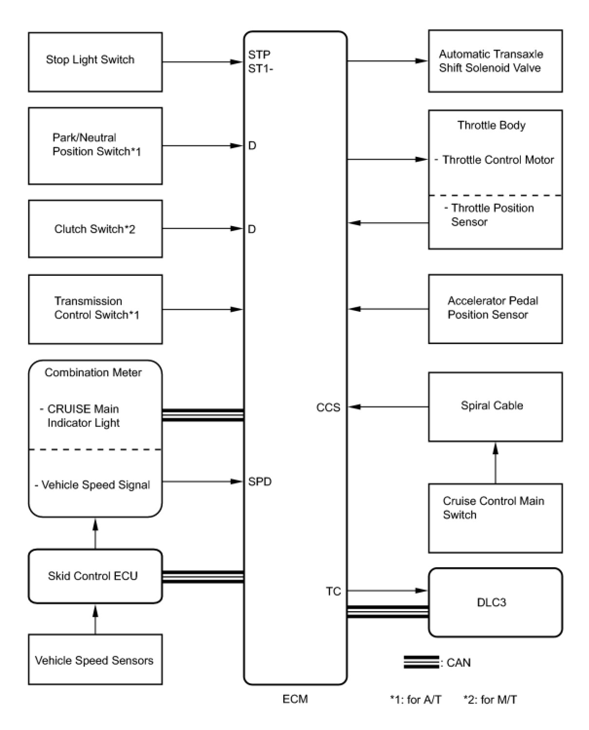 * The ECM compares the driving vehicle speed from the speed sensor with the stored vehicle speed set through the cruise control main switch. The ECM instructs the throttle valve motor of the throttle body assembly to close the valve when the driving speed is greater than the stored speed, and instructs it to open the valve when the driving speed is less than the stored speed.