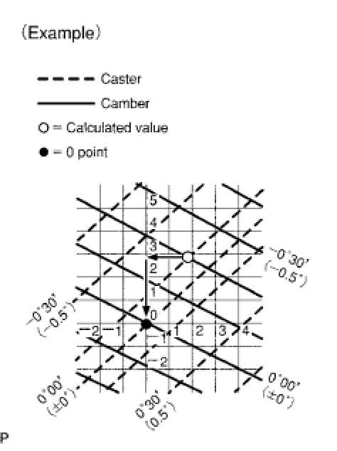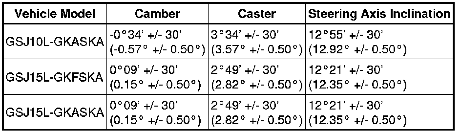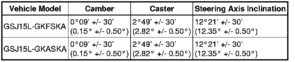 * The tolerance for the difference between the left and right wheels is 30' (0.50°) or less for both the camber and caster.