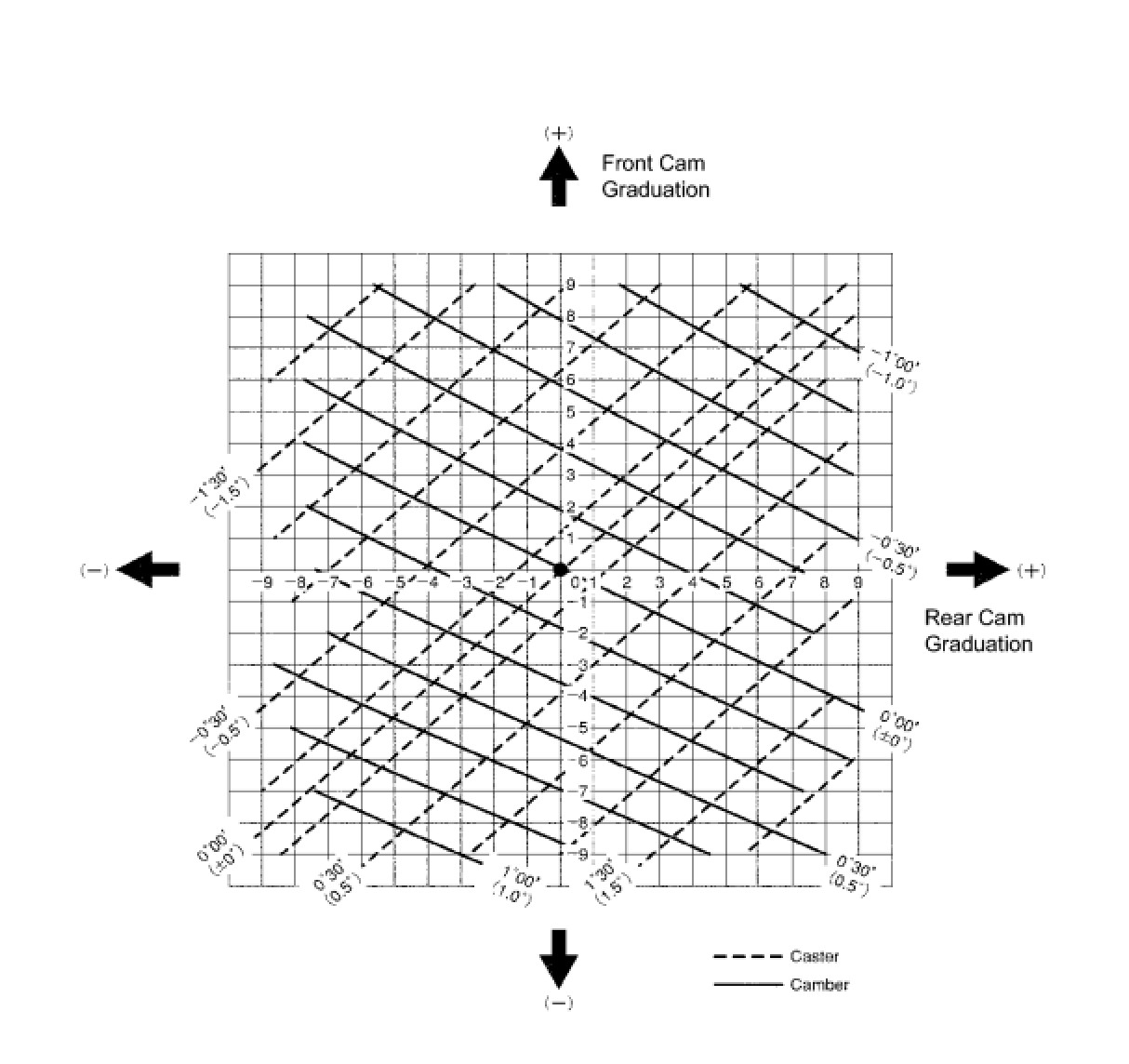 (3) As shown in the chart, read the distance from the marked point to 0 point, and adjust the front and/or rear adjusting cams accordingly.