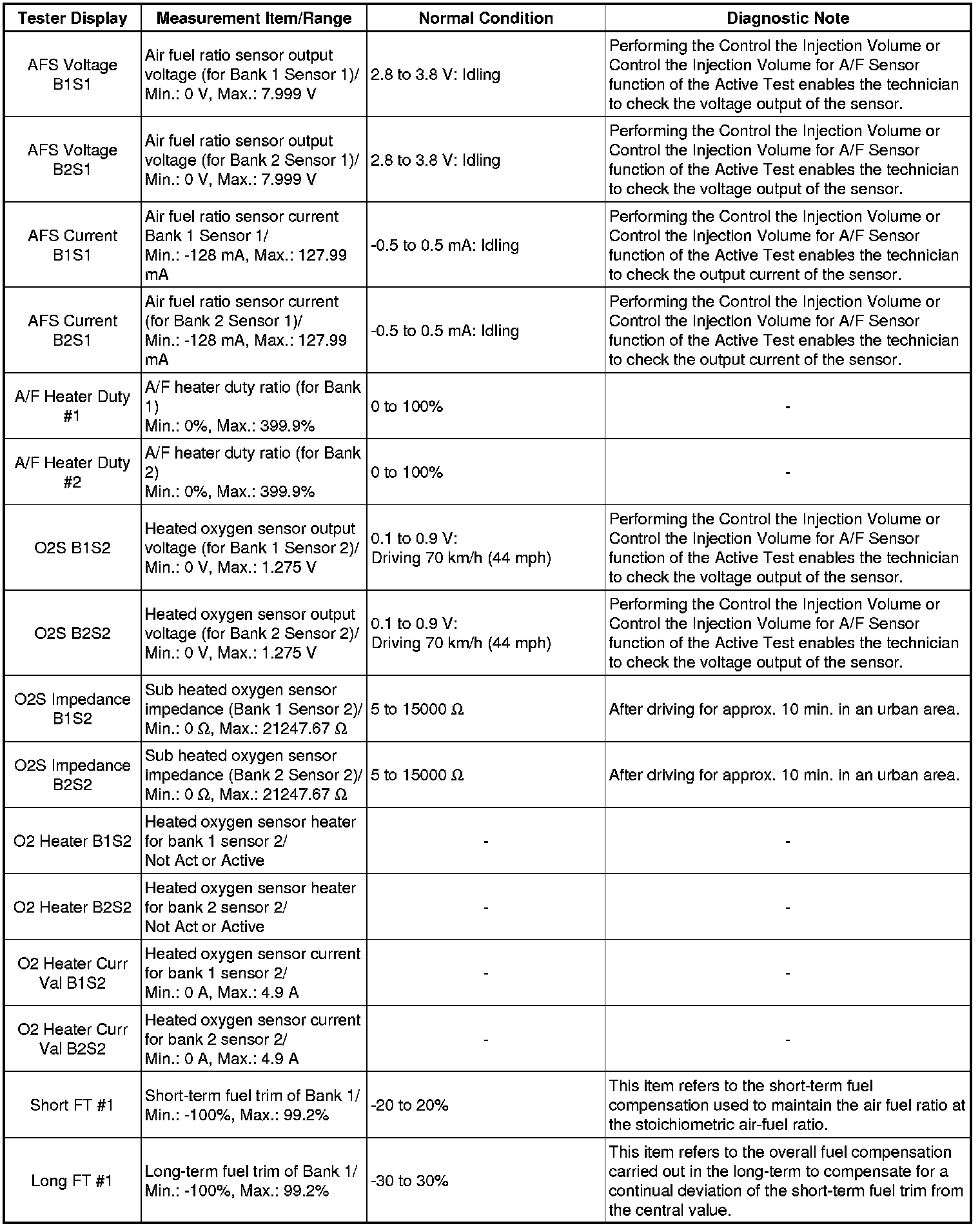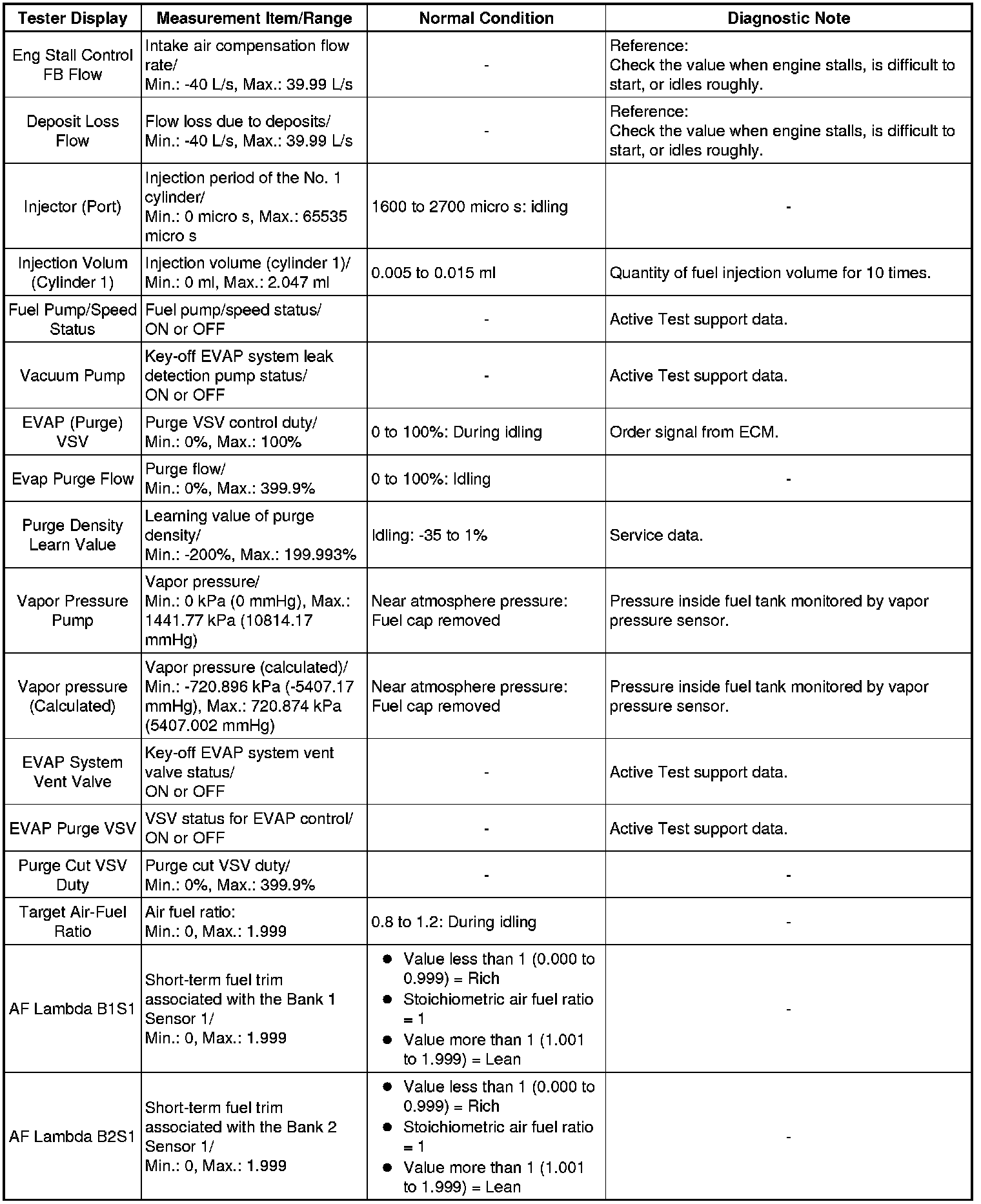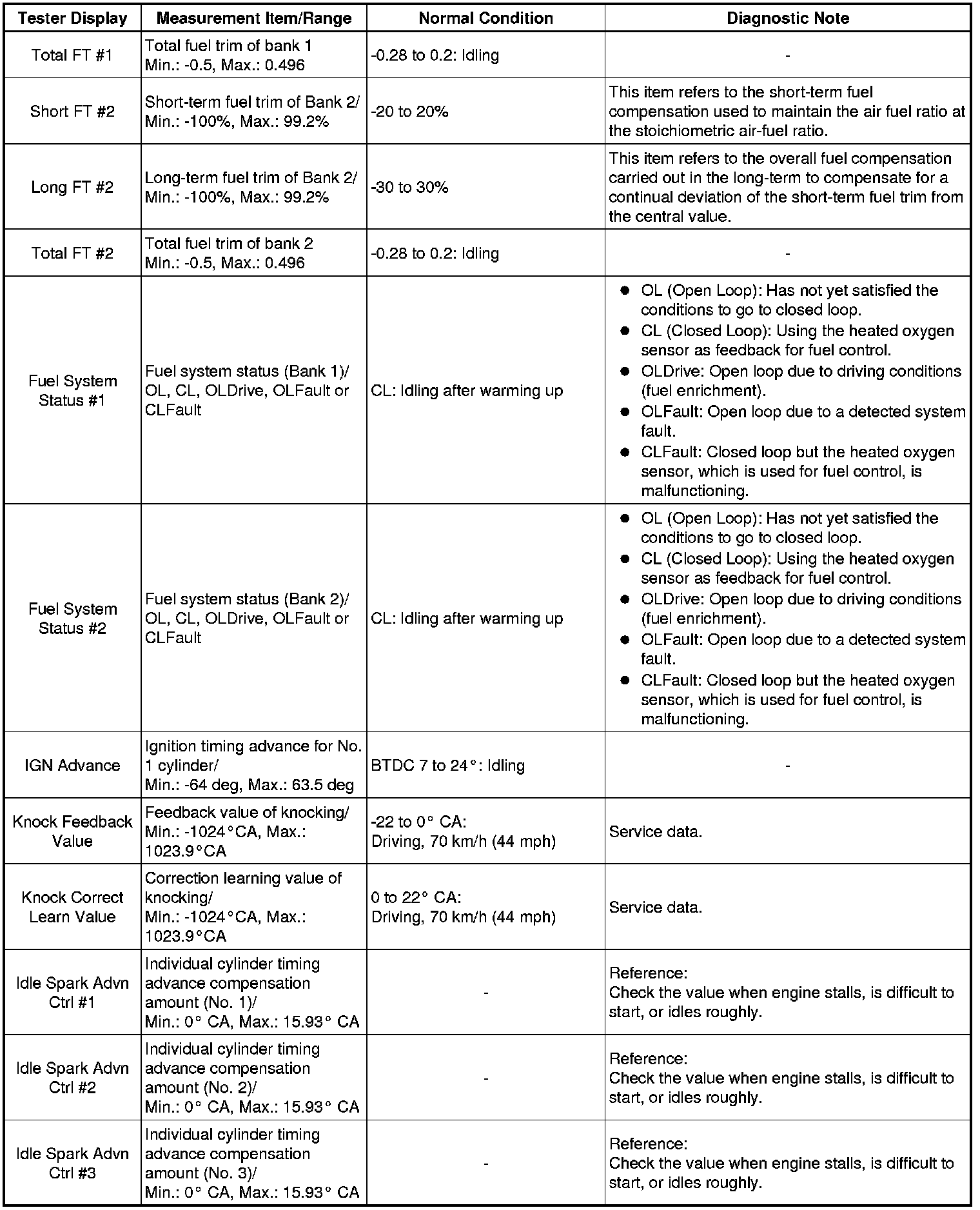 Using the Techstream to read the Data List allows the values or states of switches, sensors, actuators and other items to be read without removing any parts. This non-intrusive inspection can be very useful because intermittent conditions or signals may be discovered before parts or wiring is disturbed. Reading the Data List information early in troubleshooting is one way to save diagnostic time.
