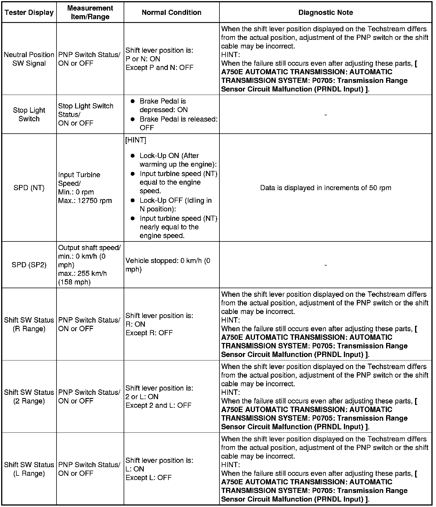 A750E AUTOMATIC TRANSMISSION: AUTOMATIC TRANSMISSION SYSTEM: DATA LIST / ACTIVE TEST