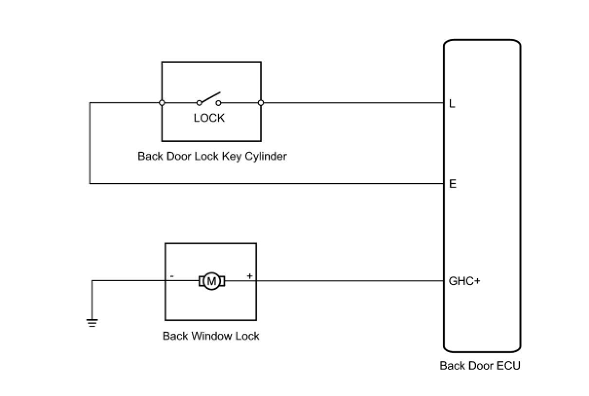 The back door ECU opens the back window by transmitting signals to the back window lock, when the ignition key is held in the LOCK position of the back door lock key cylinder for 0.8 seconds or more.