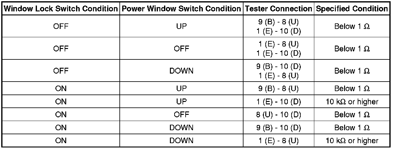 (3) If the result is not as specified, replace the power window regulator master switch.