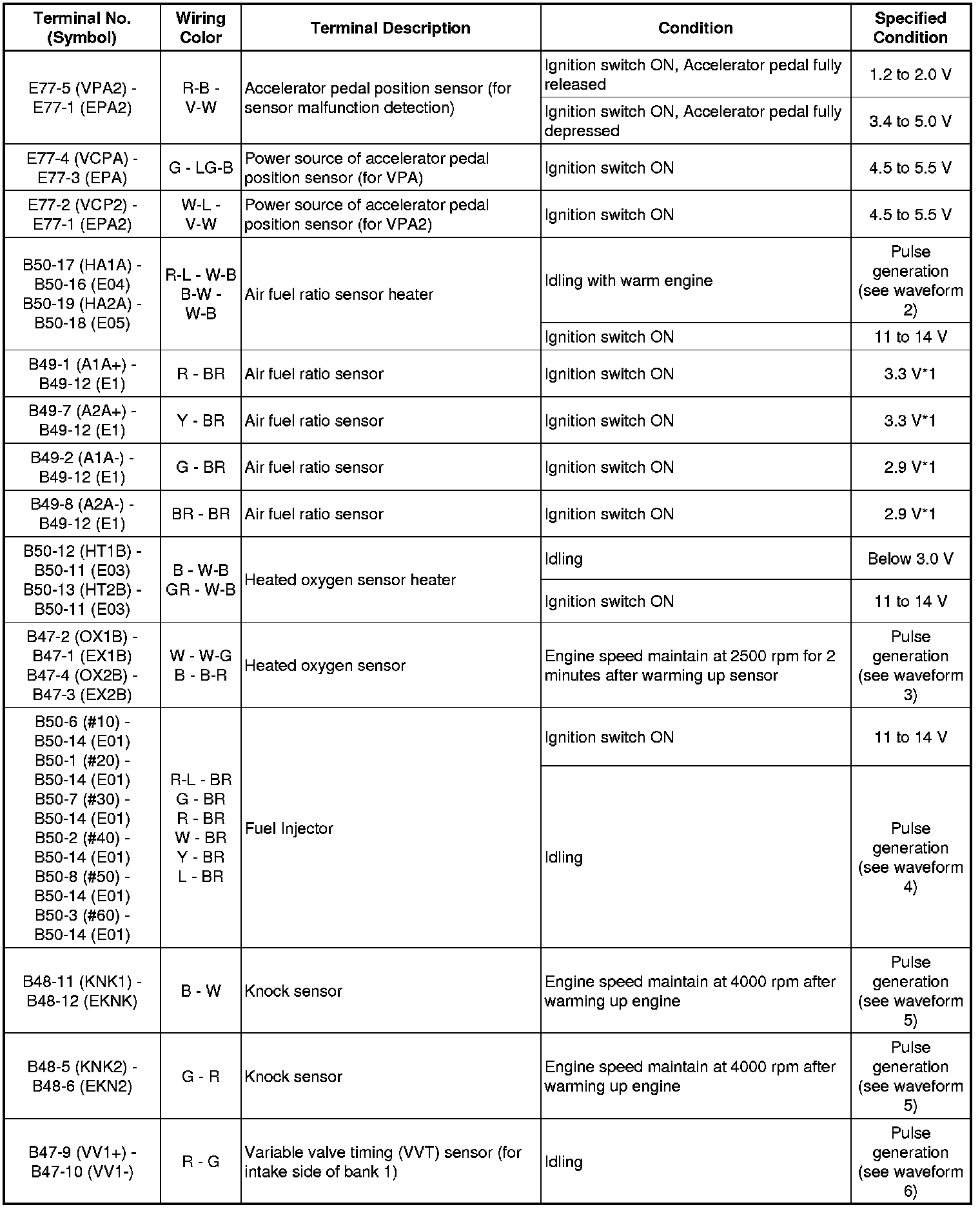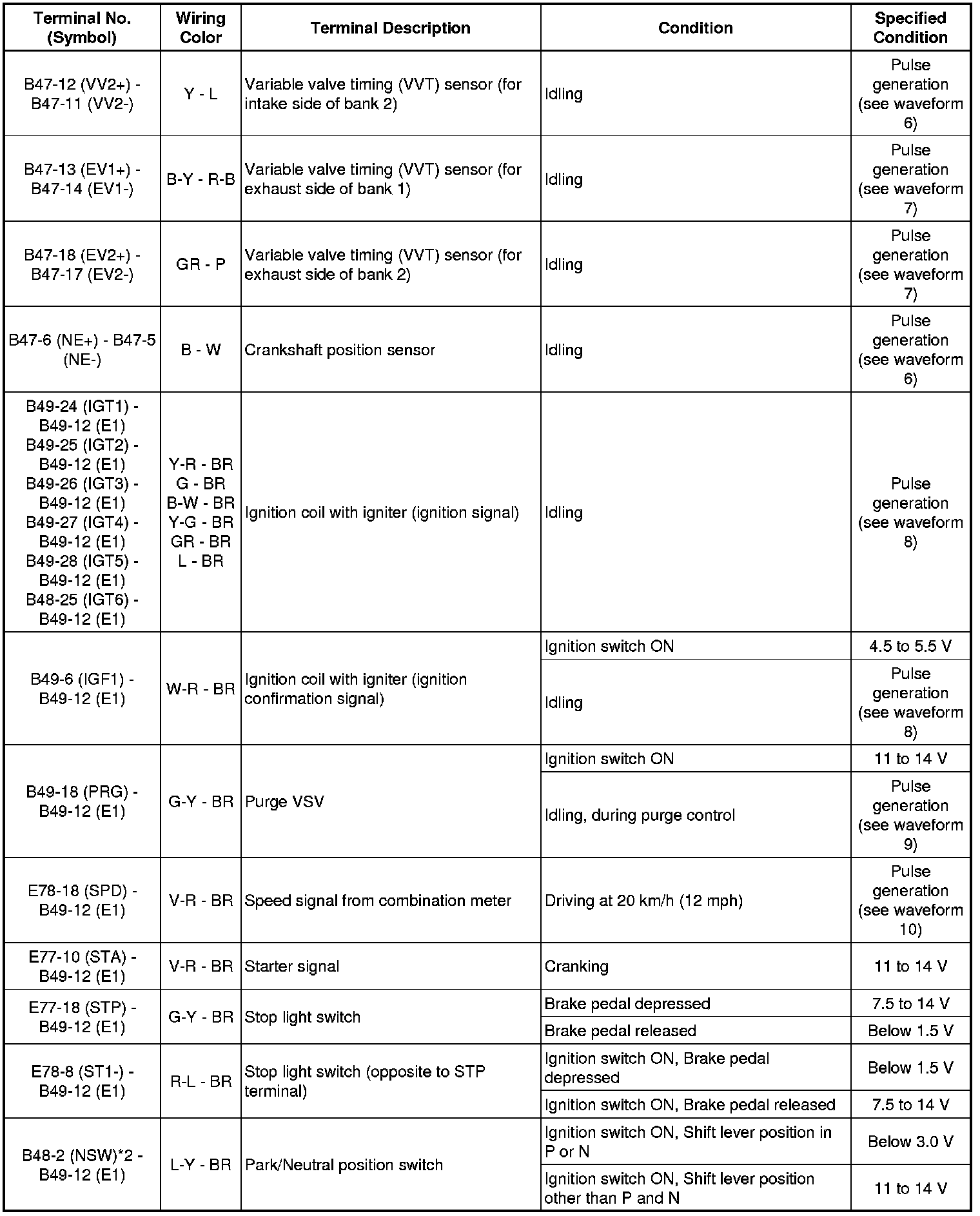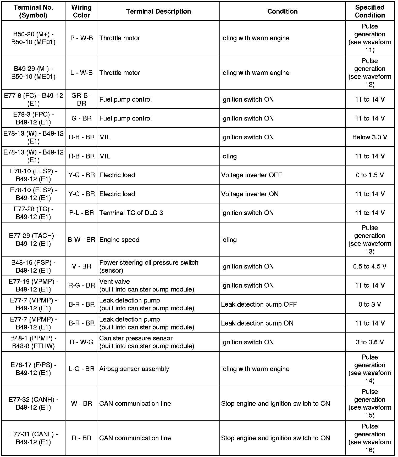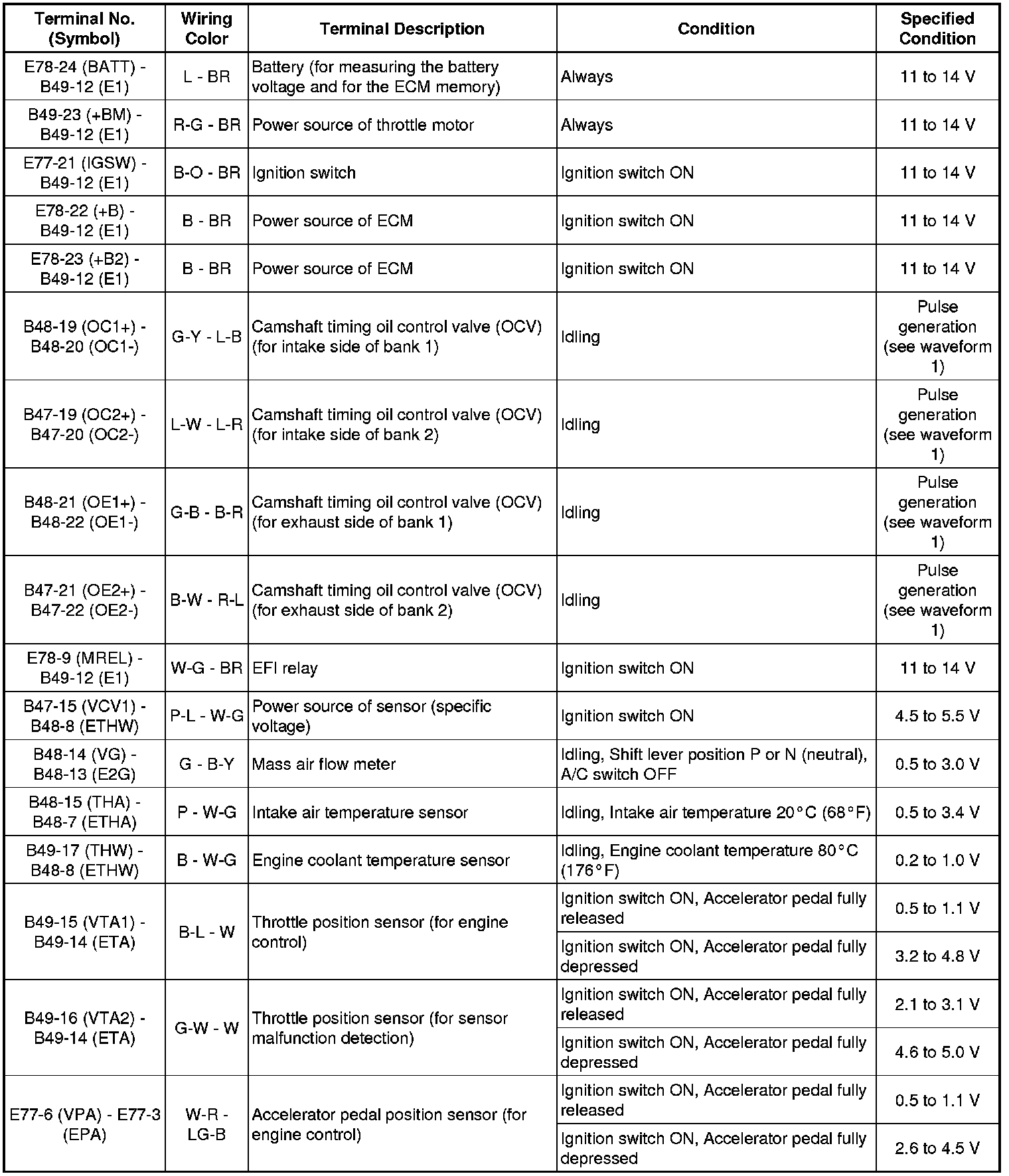 The standard normal voltage between each pair of ECM terminals is shown in the table below. The appropriate conditions for checking each pair of terminals are also indicated. The result of checks should be compared with the standard normal voltage for that pair of terminals, displayed in the Specified Condition column. The illustration above can be used as a reference to identify the ECM terminal locations.