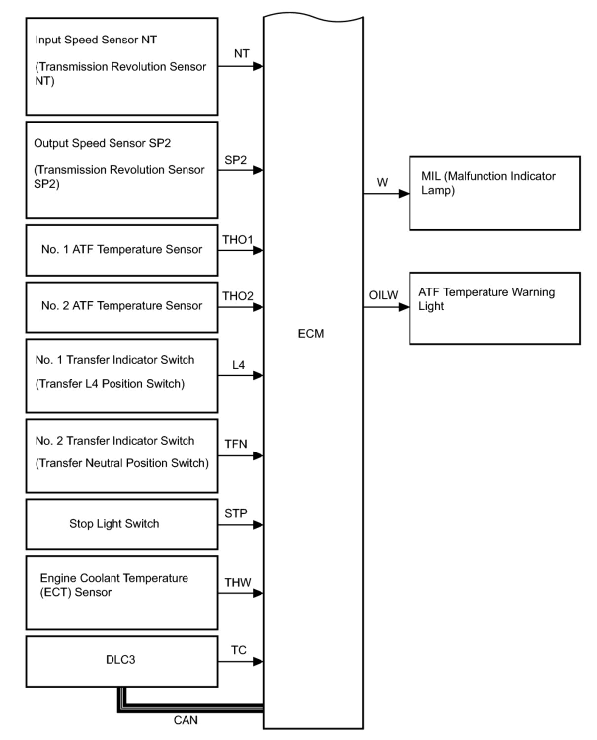 The configuration of the electronic control system in the A750F automatic transmission is as shown in the following chart.