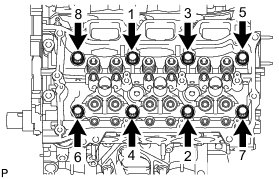 Using a 10 mm bi-hexagon wrench, install and uniformly tighten the 8 cylinder head bolts with the plate washers in several steps in the sequence shown in the illustration.