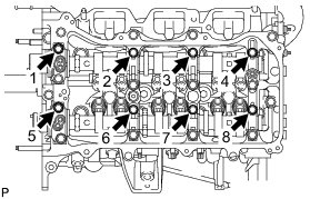 Temporarily tighten the 8 bearing cap bolts in the order shown in the illustration.