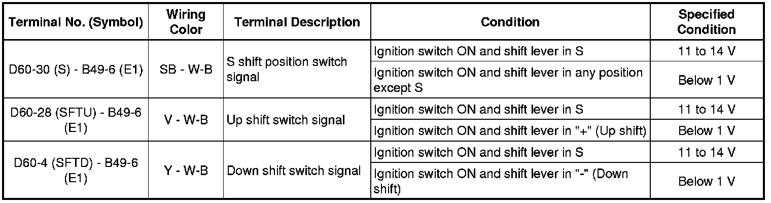 In the table, first follow the information under "Condition". Look under "Terminal No. (Symbol)" for the terminals to be inspected. The standard voltage between the terminals is shown under "Specified Condition".