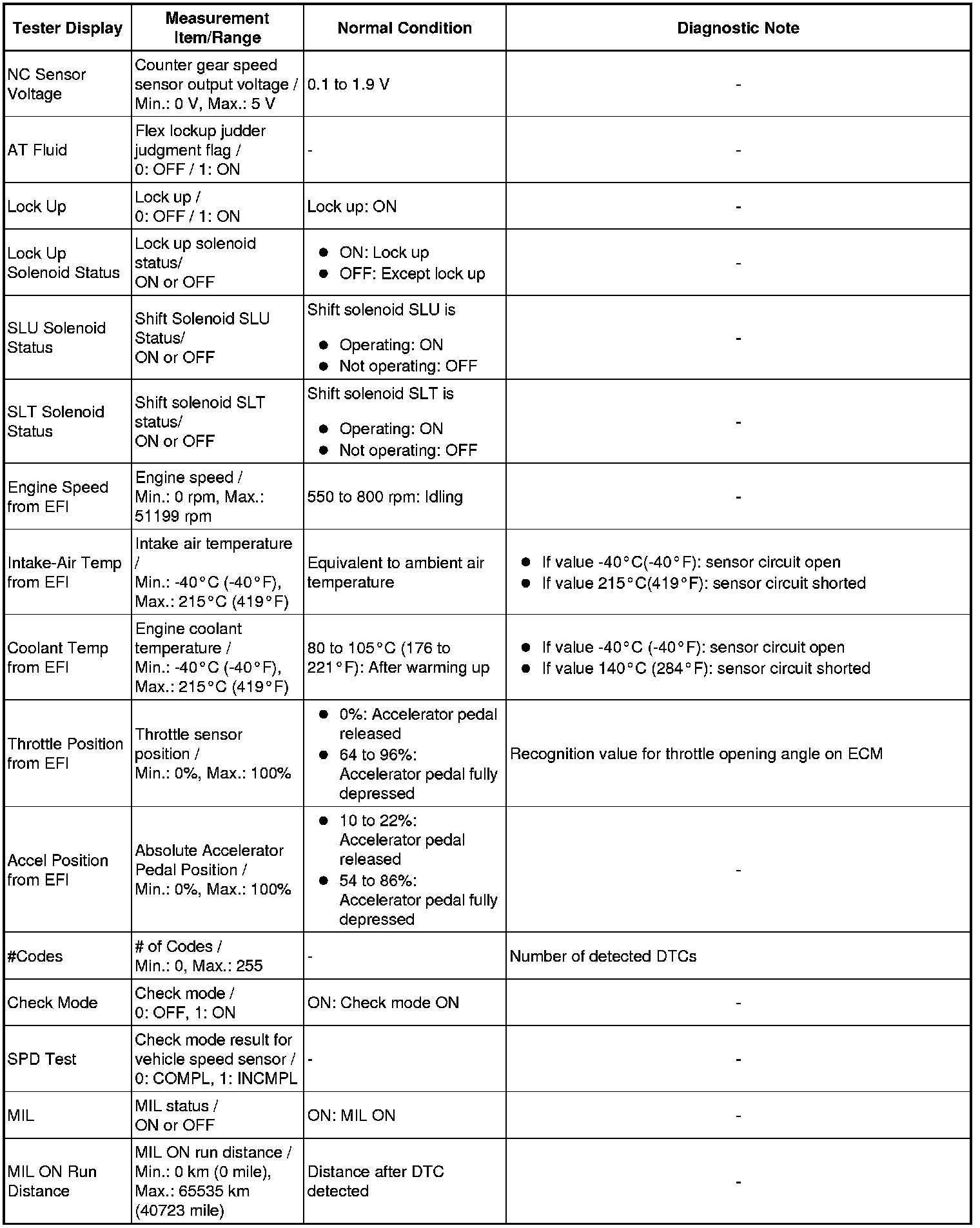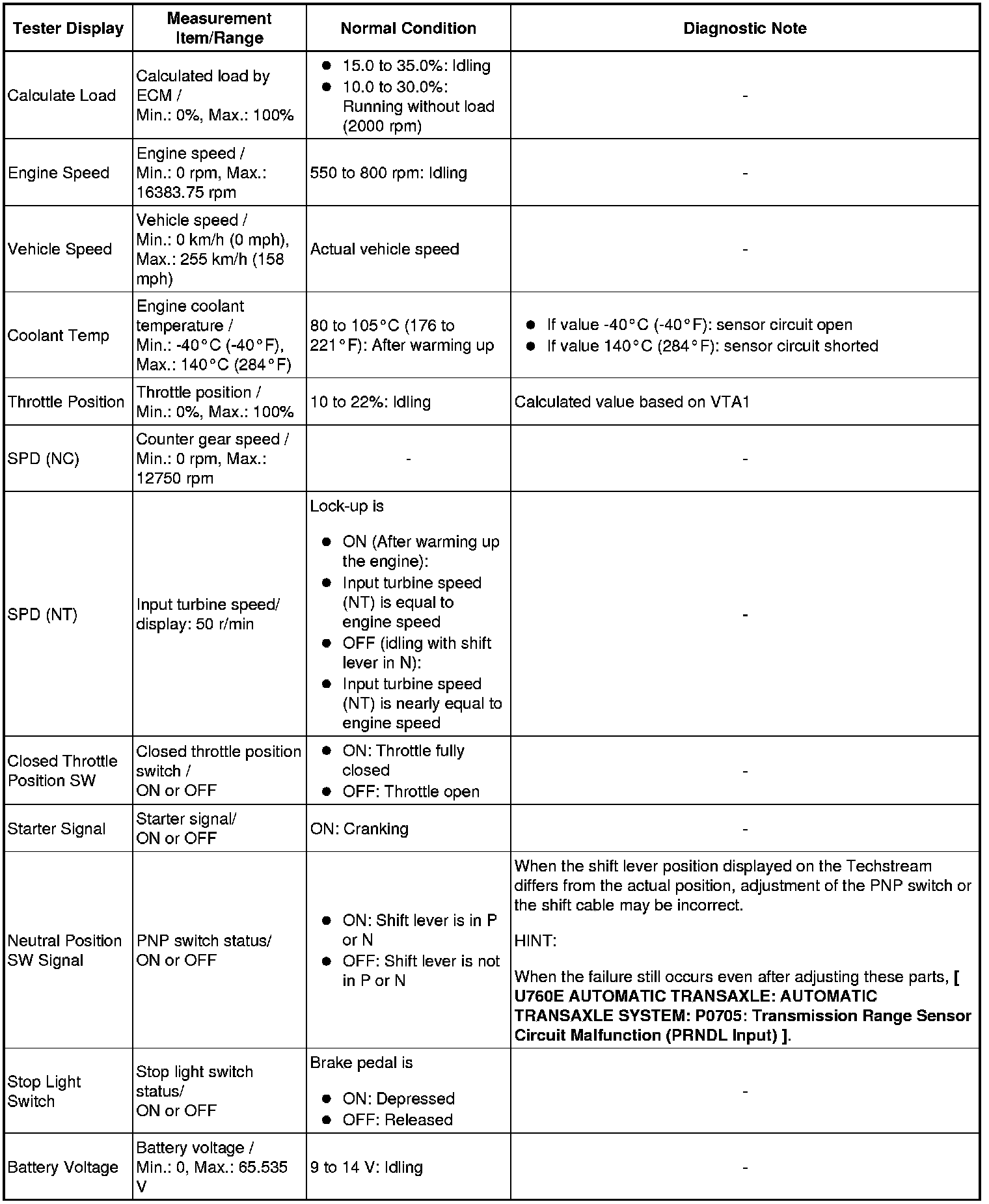 Using the Techstream to read the Data List allows the values or states of switches, sensors, actuators and other items to be read without removing any parts. This non-intrusive inspection can be very useful because intermittent conditions or signals may be discovered before parts or wiring is disturbed. Reading the Data List information early in troubleshooting is one way to save diagnostic time.