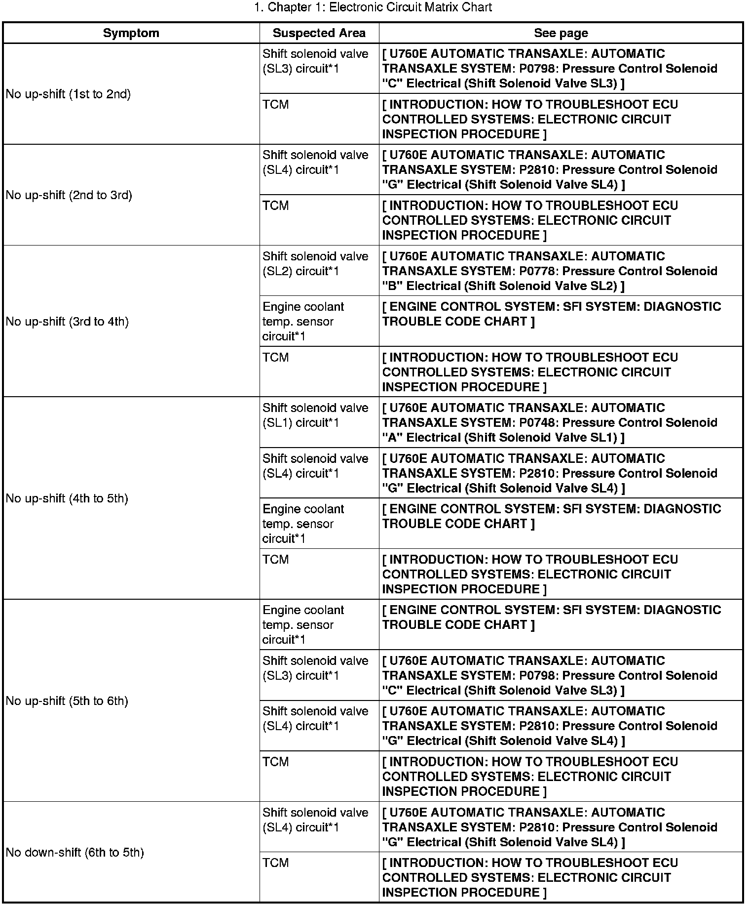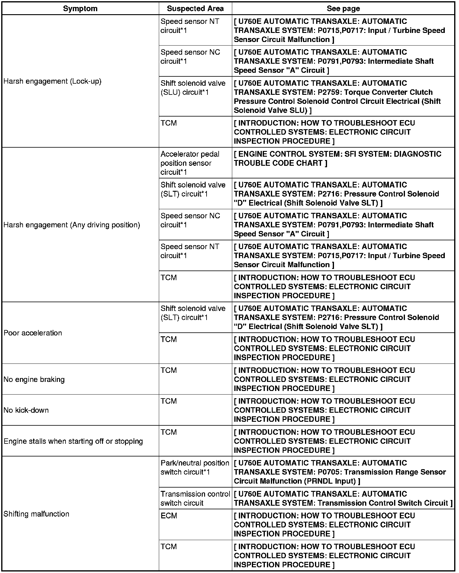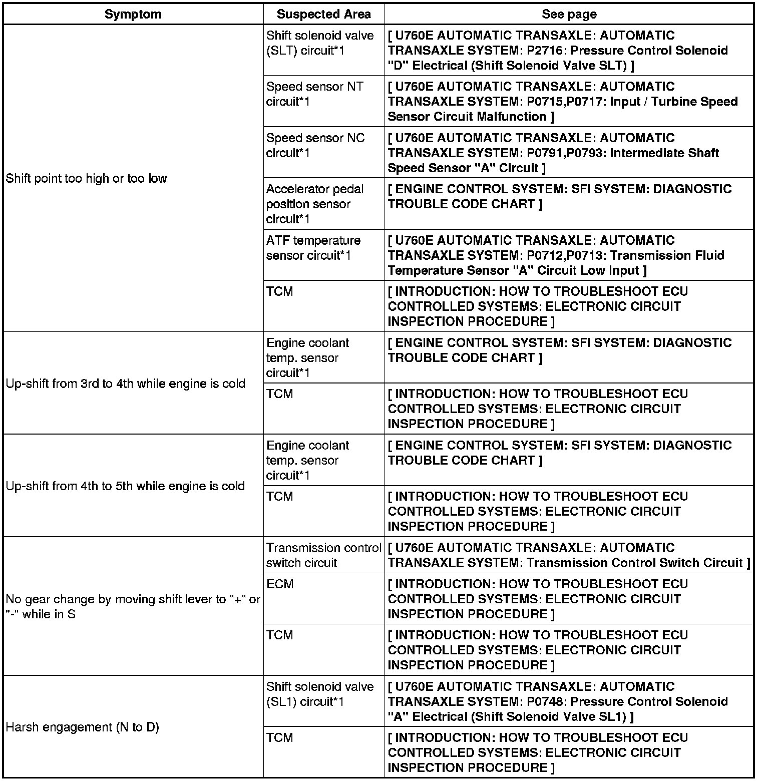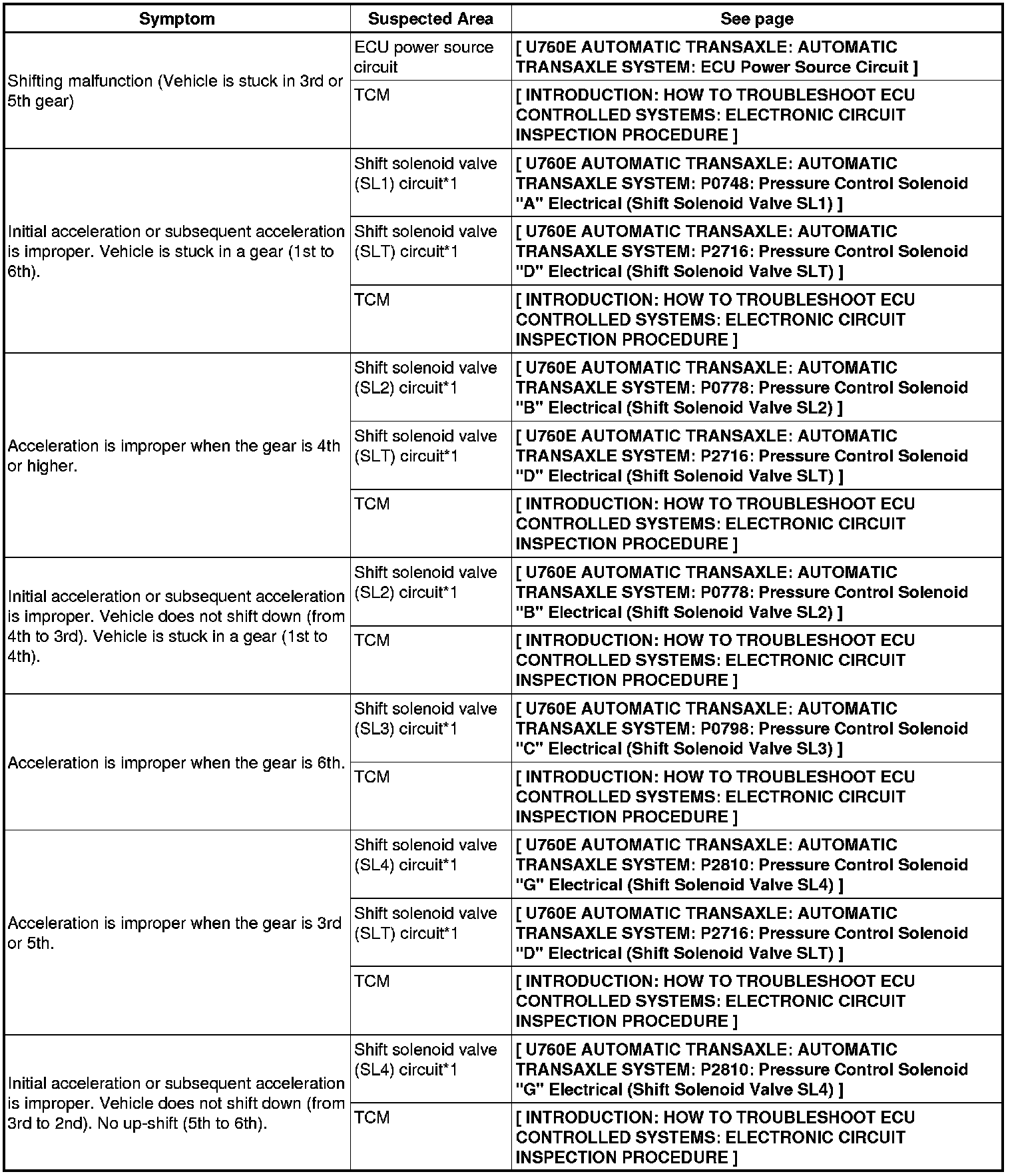 U760E AUTOMATIC TRANSAXLE: AUTOMATIC TRANSAXLE SYSTEM: PROBLEM SYMPTOMS TABLE
