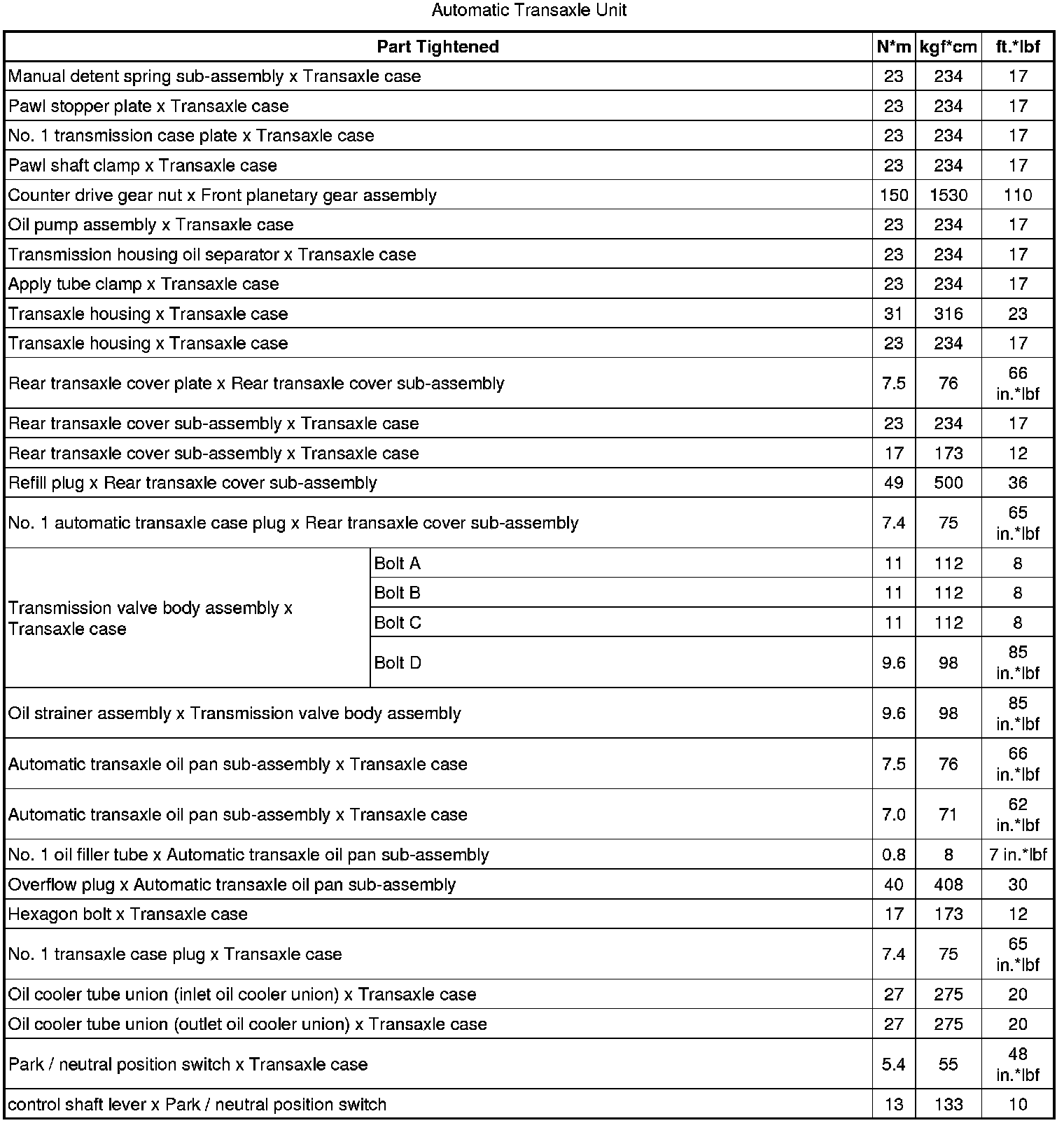 SERVICE SPECIFICATIONS: U760E AUTOMATIC TRANSAXLE: TORQUE SPECIFICATIONS