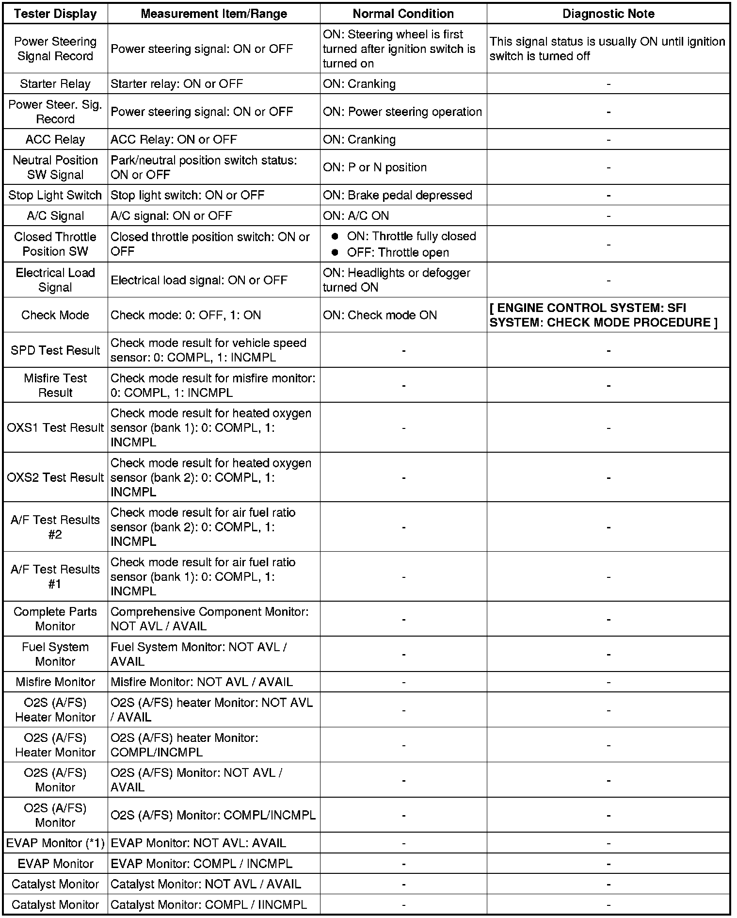(e) Perform the System Check by referring to the table below.
