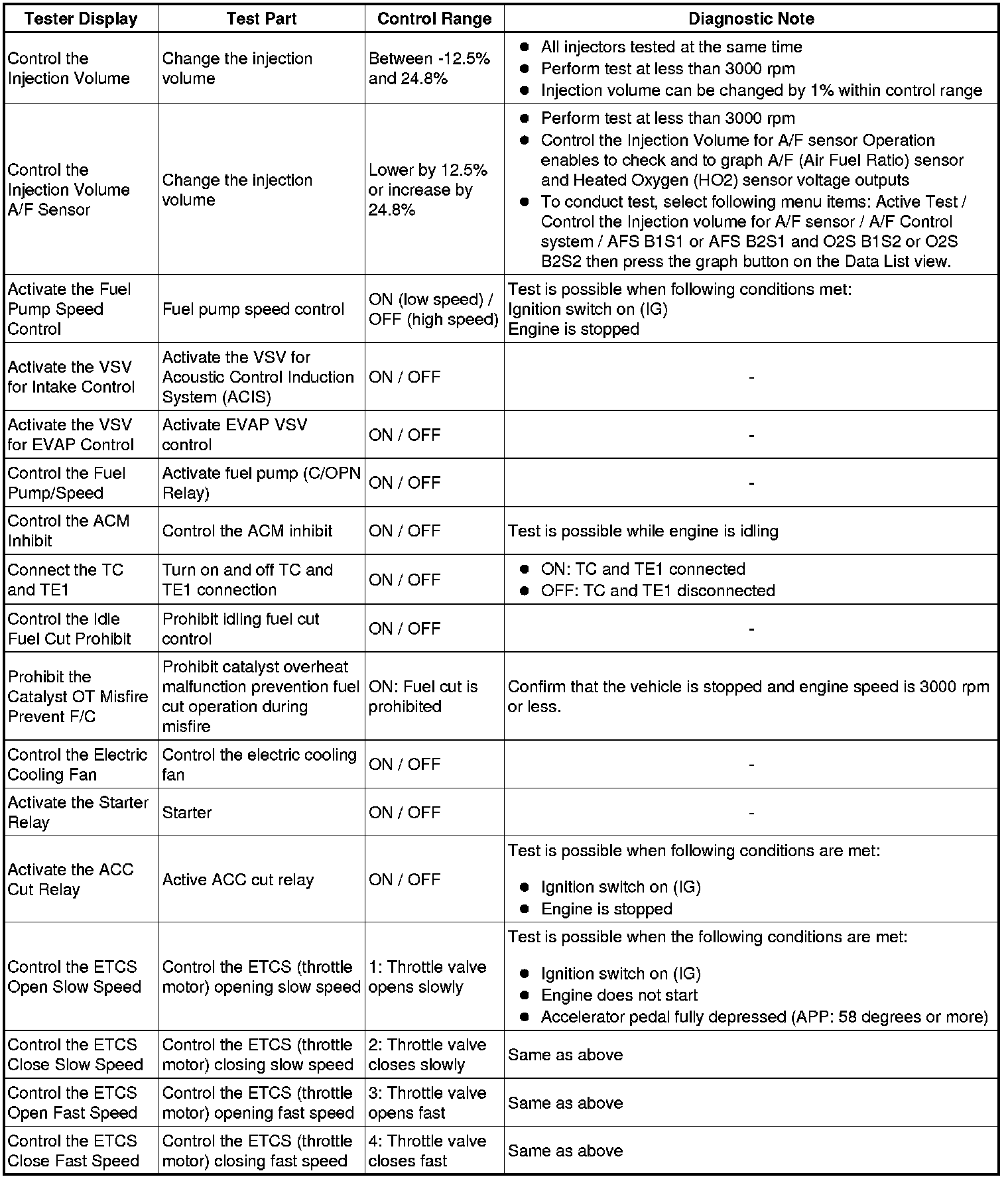 (e) Perform the Active Test by referring to the table below.