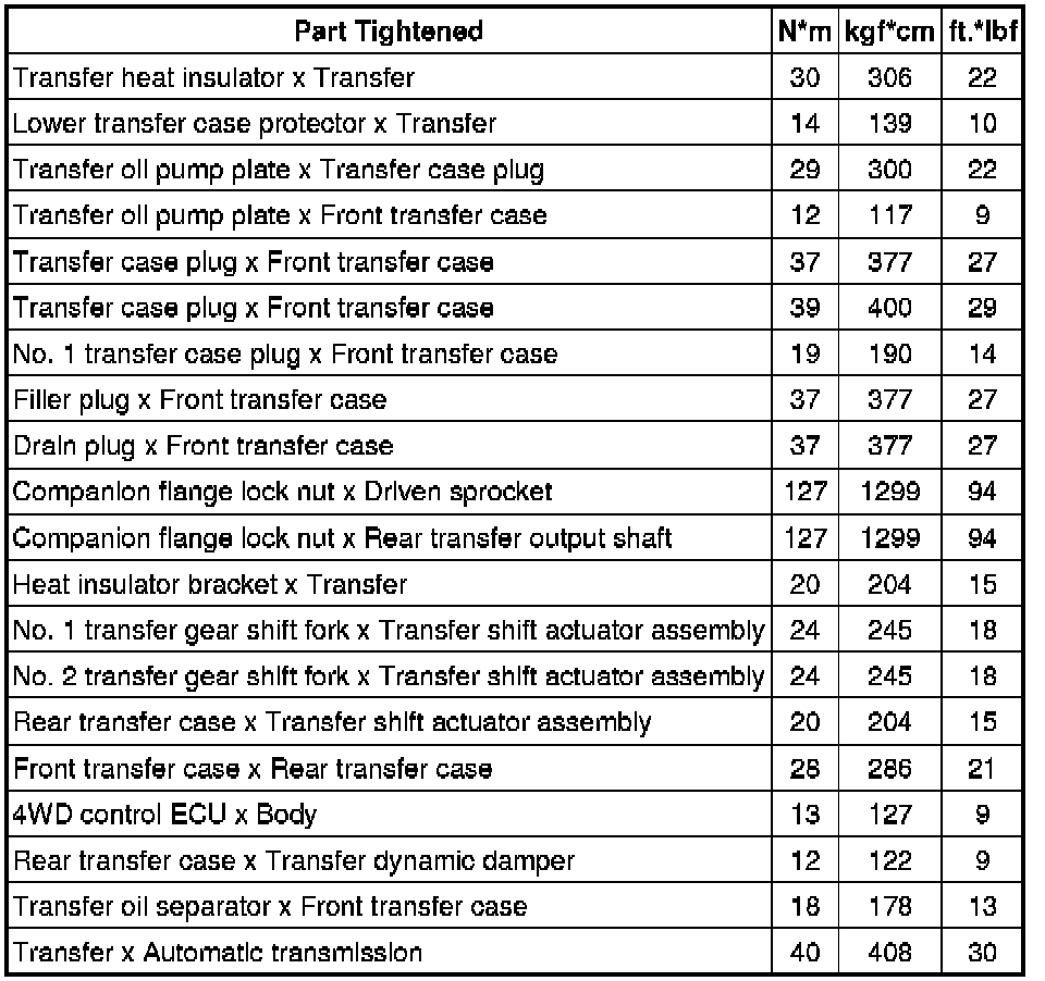 SPECIFICATIONS: JF2A TRANSFER / 4WD / AWD: TORQUE SPECIFICATIONS