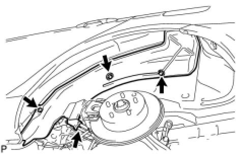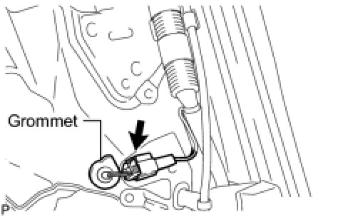 (f) Insert the connector and grommet to the inside of the vehicle through the passage hole in the wheel well.