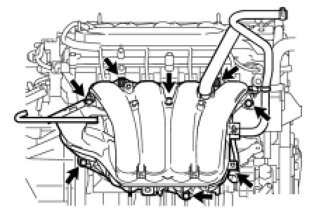 (d) Remove the 5 bolts, 2 nuts and intake manifold.