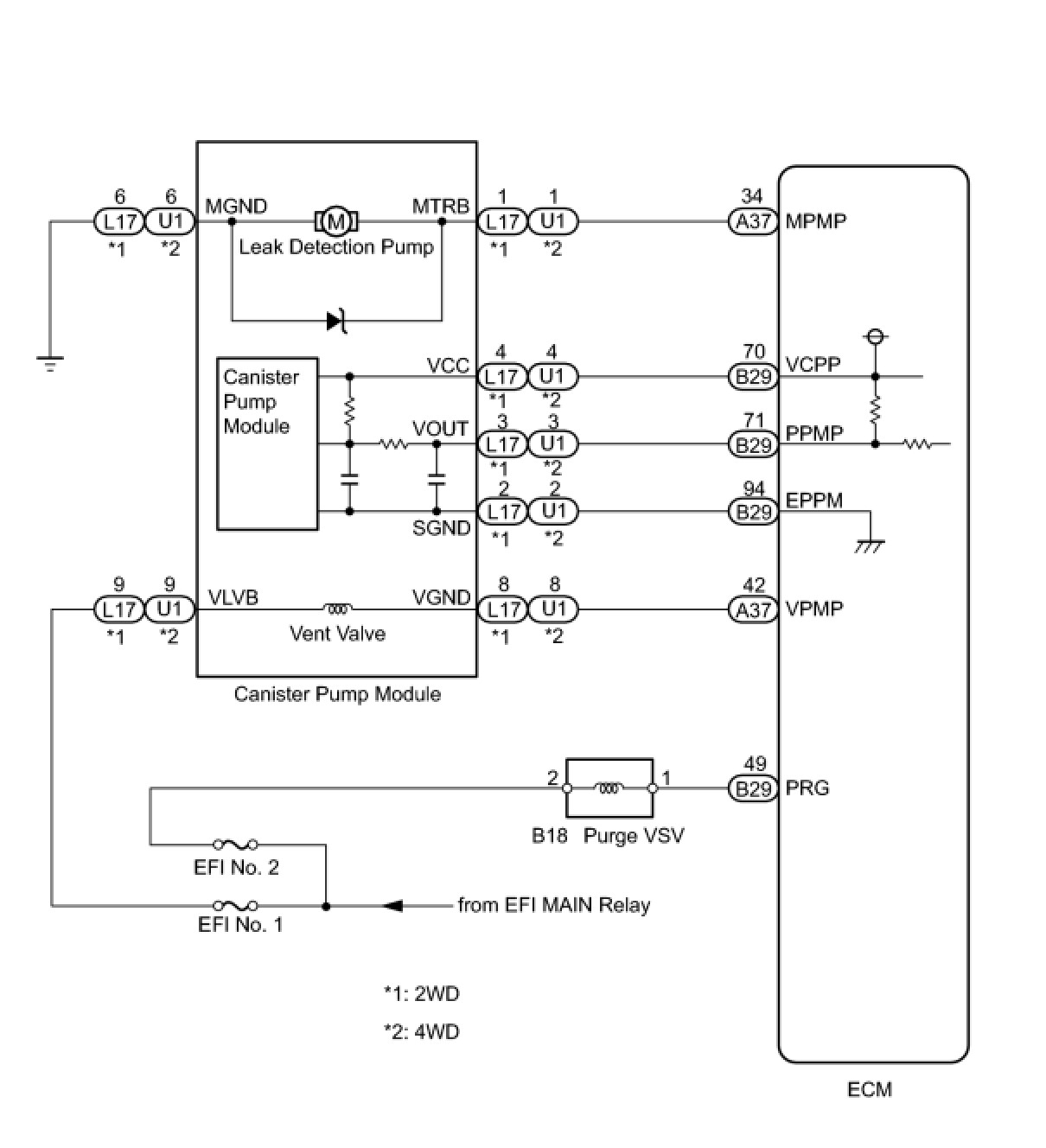 The leak detection pump creates negative pressure (vacuum) in the EVAP system and the pressure is measured. Finally, the ECM monitors for leaks from the EVAP system, and malfunctions in both the canister pump module and purge VSV, based on the EVAP pressure.
