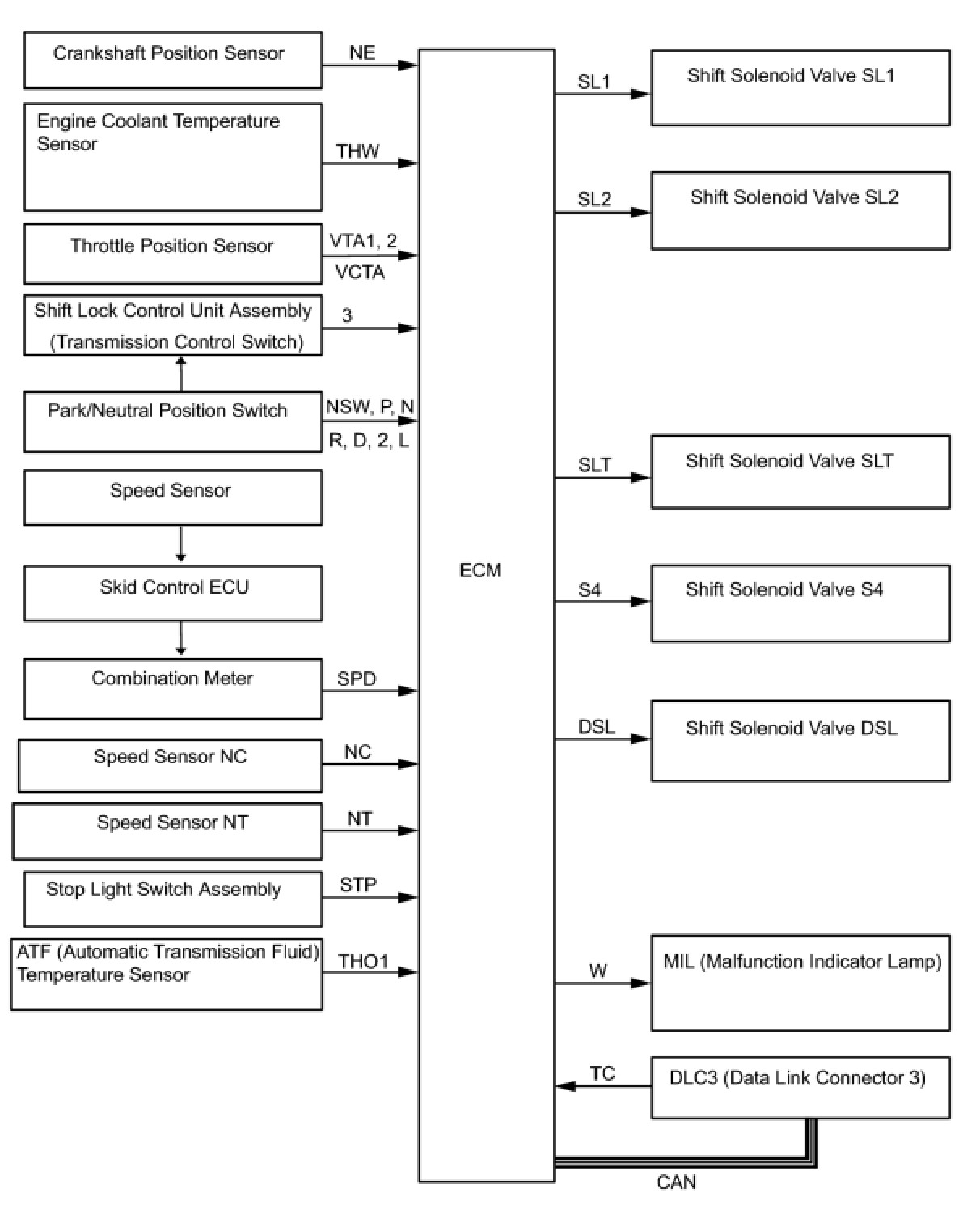 (a) The ECT (Electronic controlled automatic transmission/transaxle) is an automatic transmission/transaxle that electronically controls shift timing using the ECM. The ECM detects electrical signals that indicate engine and driving conditions, and controls the shift point, based on driver habits and road conditions. As a result, fuel efficiency and power transmission performance are improved.