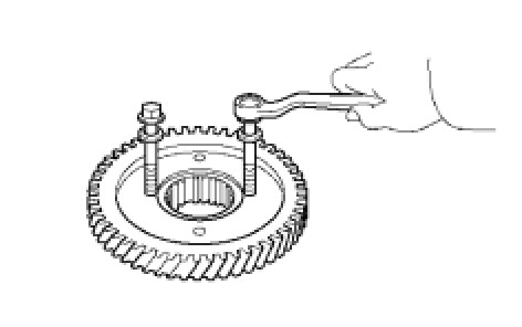 (b) As shown in the illustration, tighten 2 service bolts evenly and make a clearance of approximately 20.0 mm (0.787 in.) between the counter drive gear and the inner race.