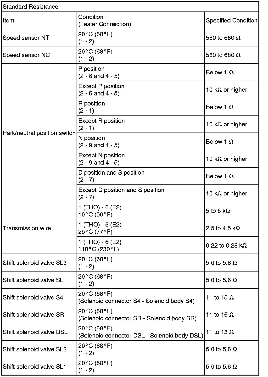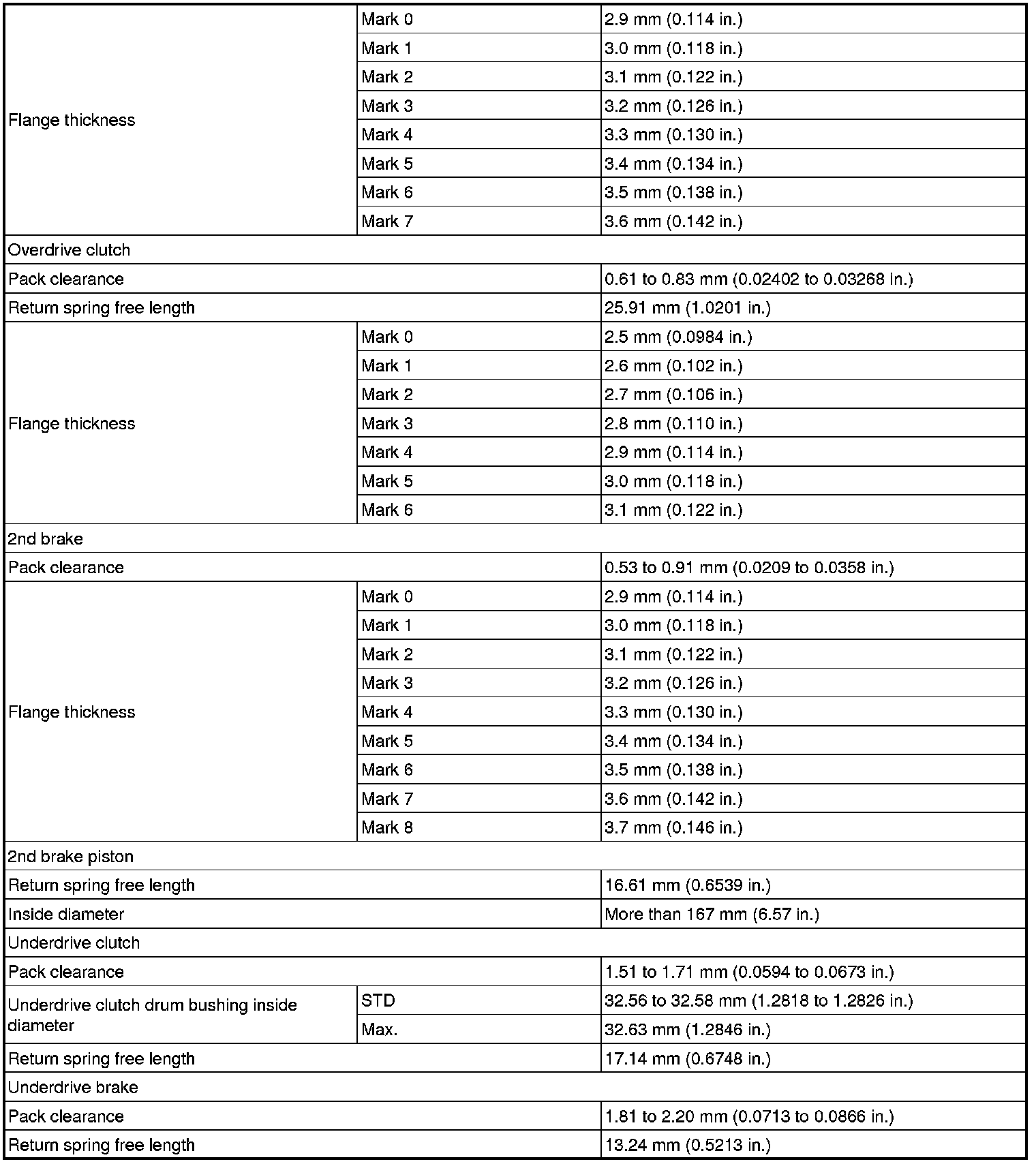 SPECIFICATIONS: U250E AUTOMATIC TRANSMISSION / TRANSAXLE: SERVICE DATA