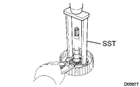 (d) Place SST on the clutch balancer and compress the piston return spring with a press.