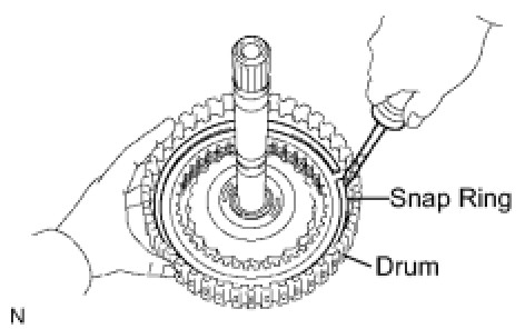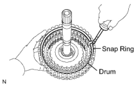 (e) Using a snap ring expander, install the snap ring to the direct clutch drum.