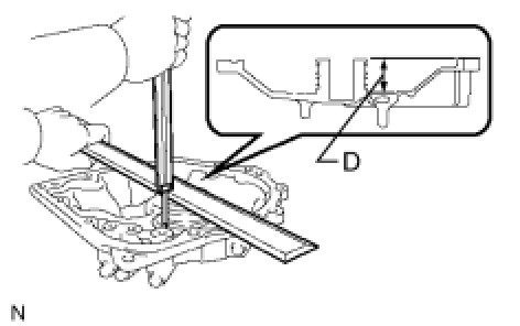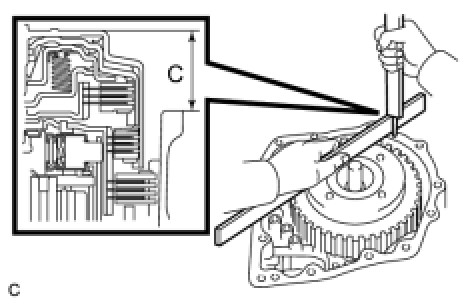 (d) As shown in the illustration, place a straightedge on the direct clutch drum and measure the distance between the transaxle case and the straightedge using a vernier caliper (Dimension C).