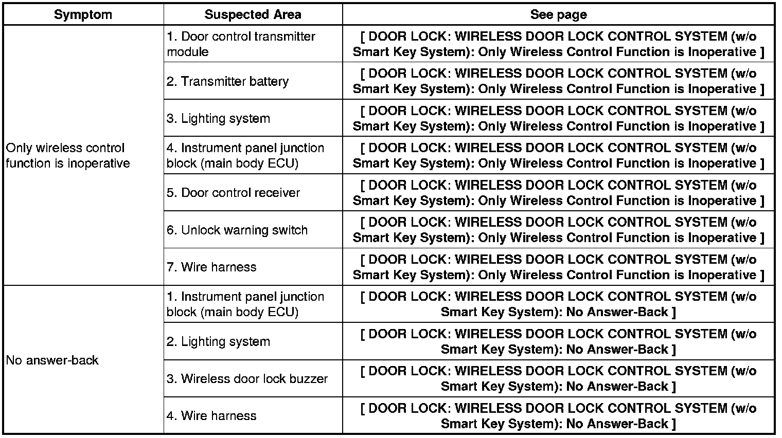 DOOR LOCK: WIRELESS DOOR LOCK CONTROL SYSTEM (w/o Smart Key System): PROBLEM SYMPTOMS TABLE
