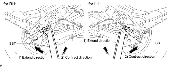 (2) If the toe-in value deviates towards the outside, turn the adjusting tube of the longer No. 1 suspension arm assembly in the direction which decreases arm length until the difference between the left and right suspension arms is within the specification.