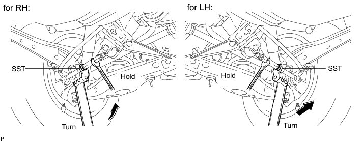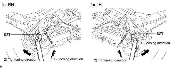(k) Hold the adjusting tube in place and, using SST, tighten the nut on the rubber bush side and nut on the ball joint side in the following order: 1) rubber bush side, 2) ball joint side, 3) rubber bush side.*8
