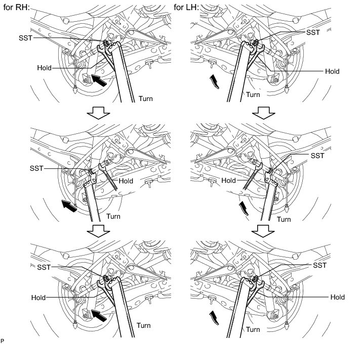 (l) Final check, hold the adjusting tube in place and, using SST, tighten the nut on the rubber bush side and nut on the ball joint side in the following order: 1) rubber bush side, 2) ball joint side, 3) rubber bush side.*9