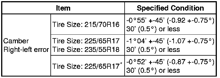 * Camber is not adjustable. If the measurement is not within the specified range, inspect the suspension parts for damage and/or wear, and replace them if necessary.